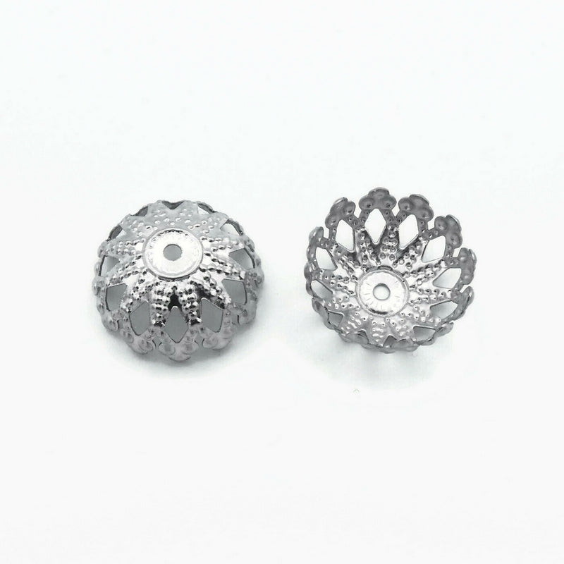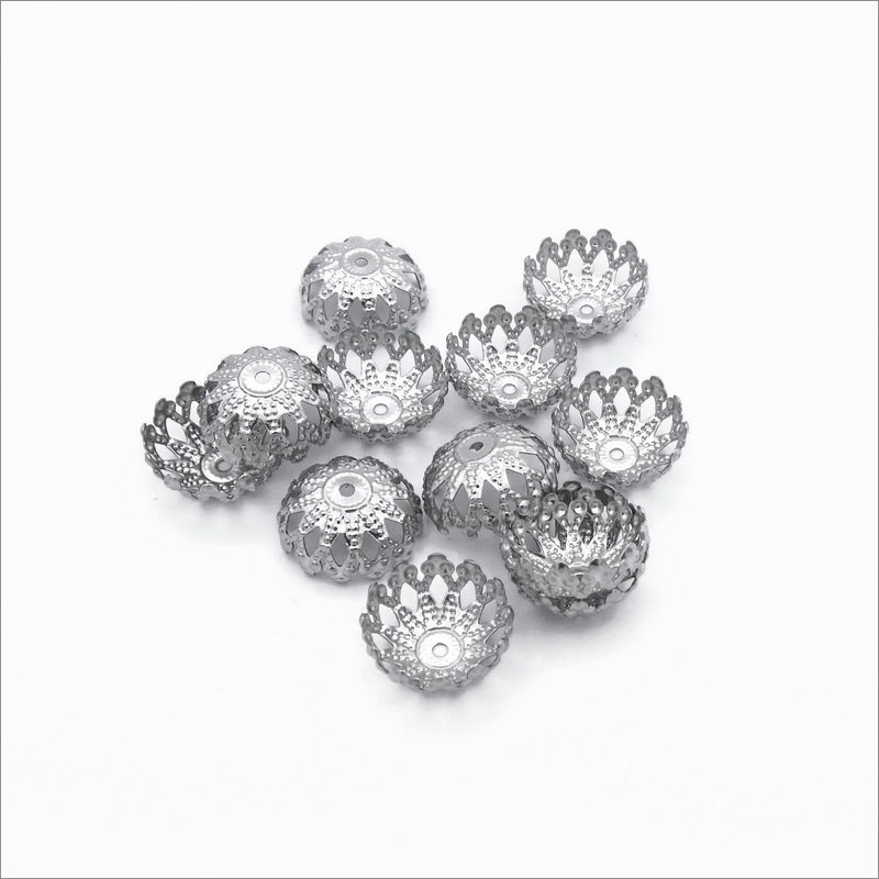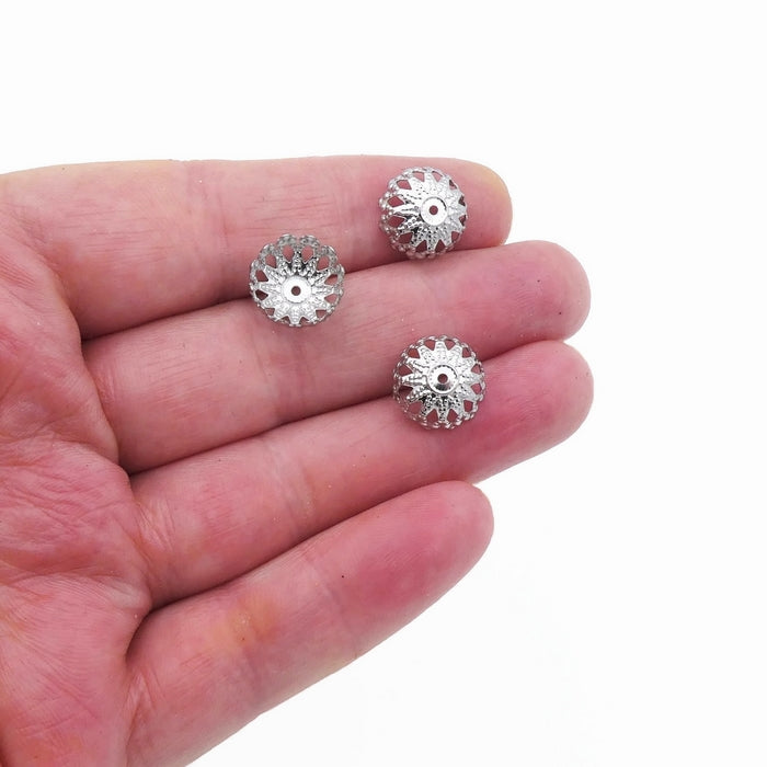 50 stainless steel embossed bead caps with a 12mm diameter.