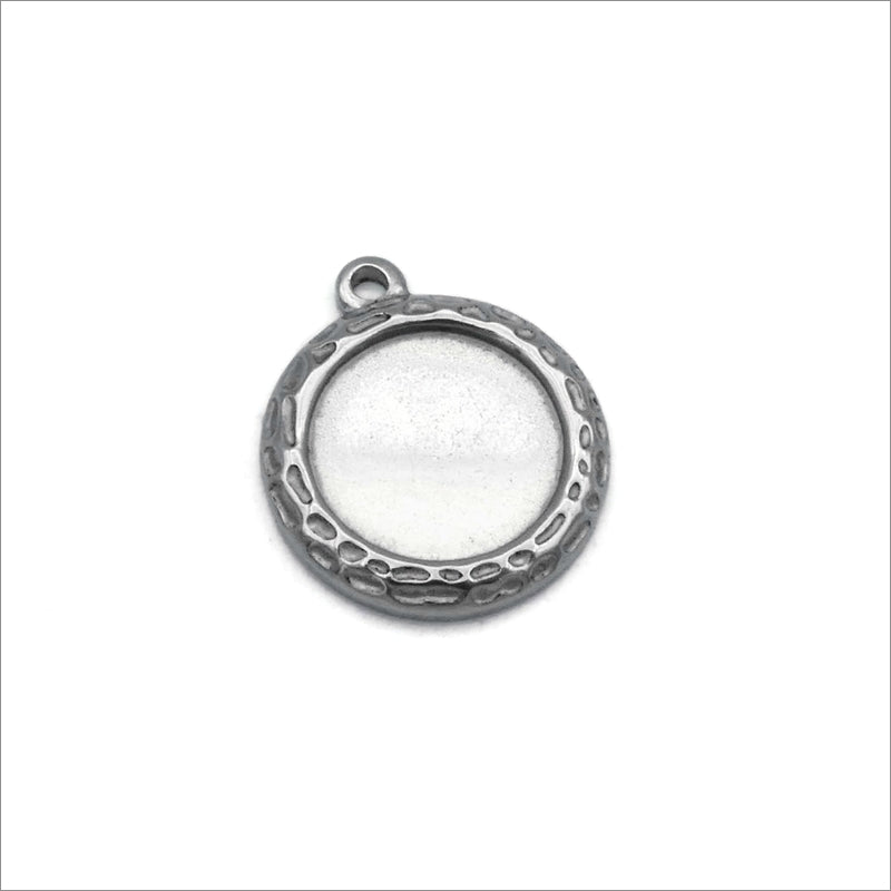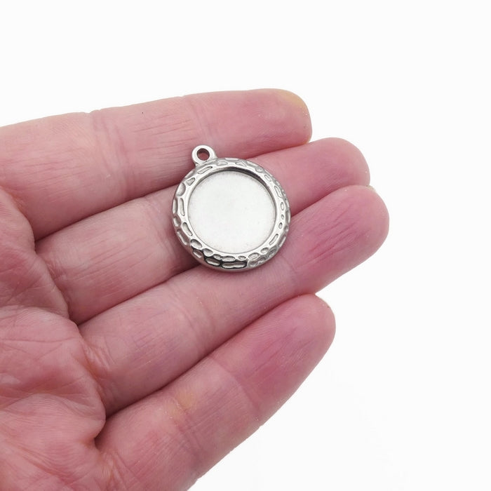 Three solid stainless steel pendant settings, suitable for round, flatback 16mm cabochons, and featuring a hammered-style pattern around the frame.