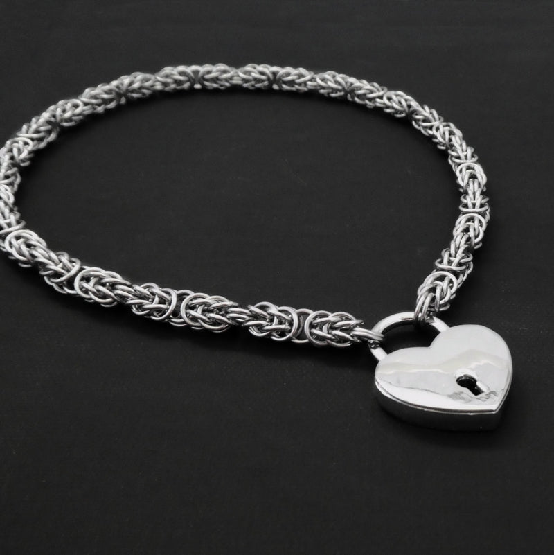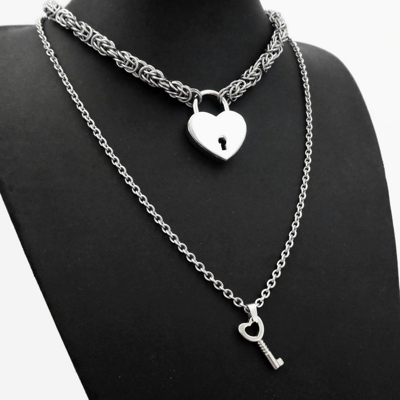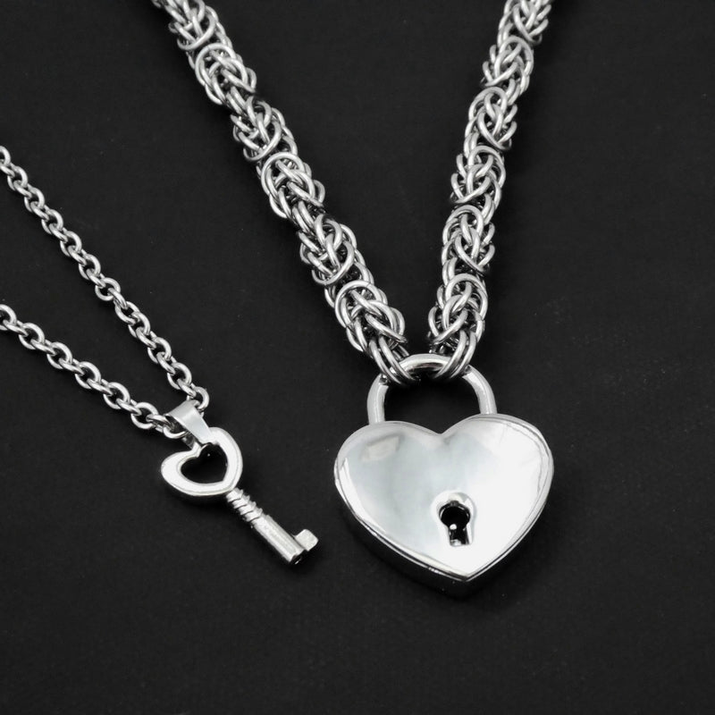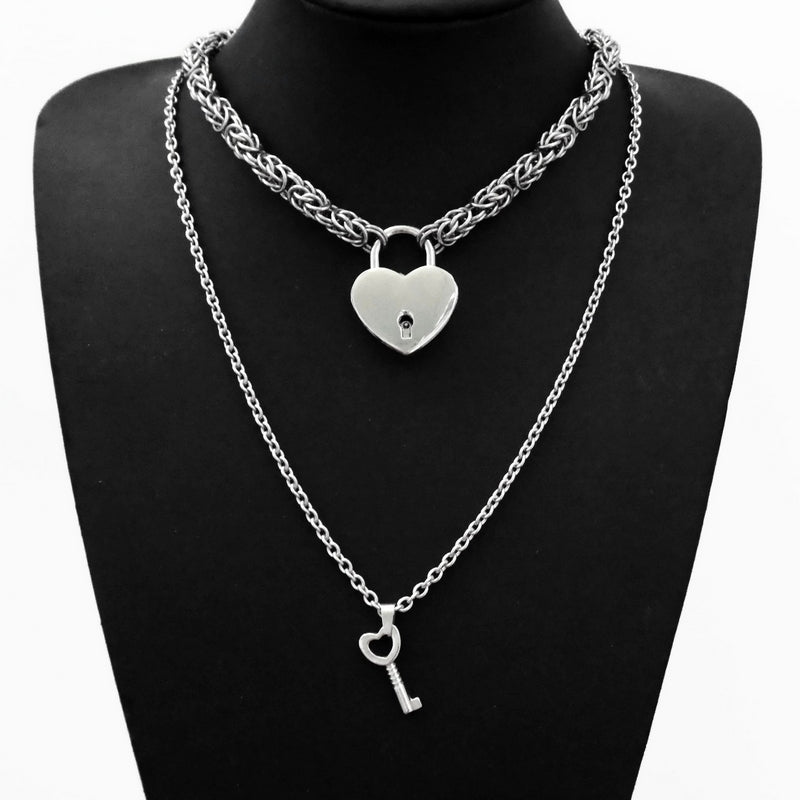 A necklace set comprised of a thick, handcrafted chain with a heart-shaped padlock pendant, complete with a key on a 60cm (23.6") stainless steel chain.