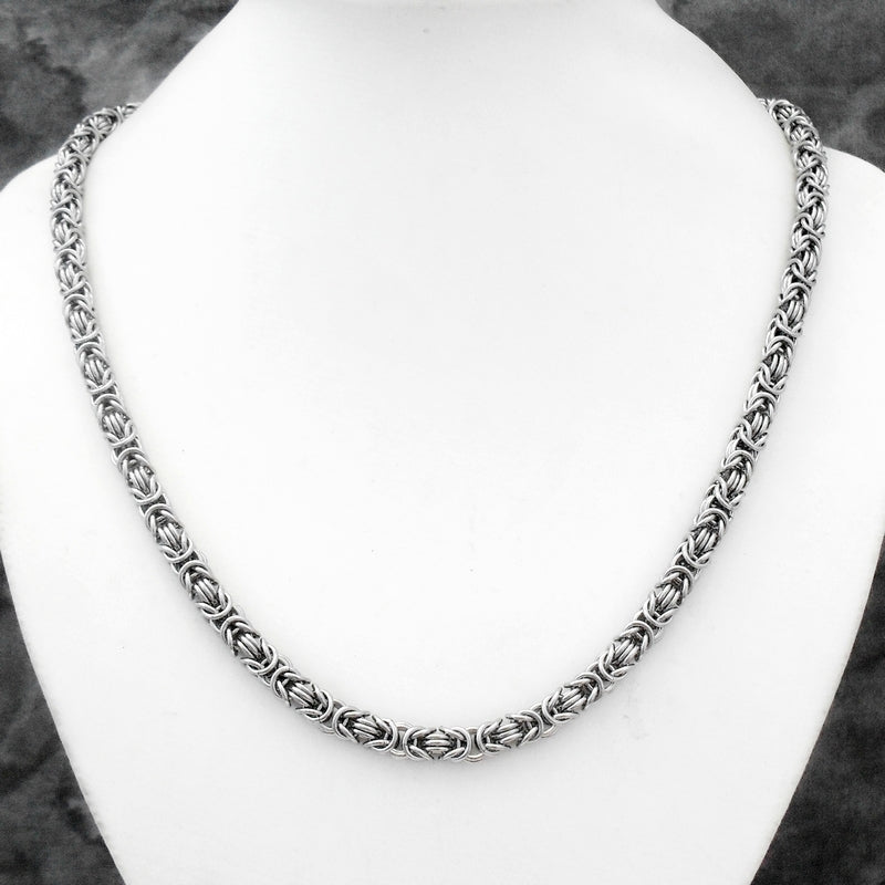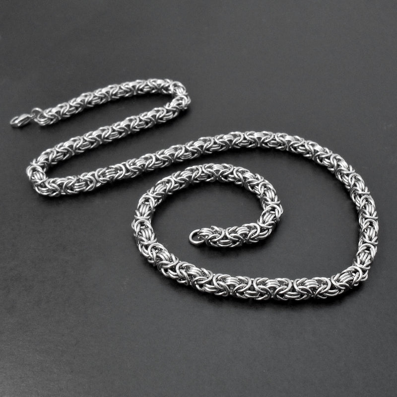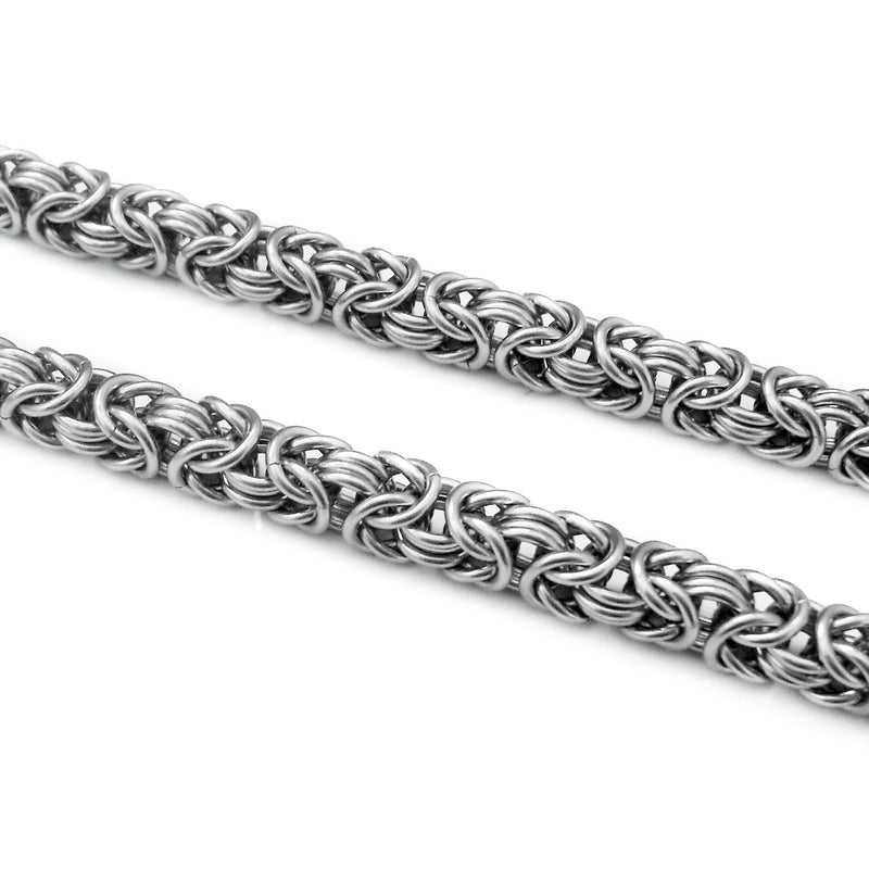 A handmade necklace constructed from premium quality 316 grade flush cut stainless steel rings, using the Byzantine chain mail weave and with tripled links (3 rings at the centre of the links instead of the traditional 2), finished with a stainless steel lobster clasp.