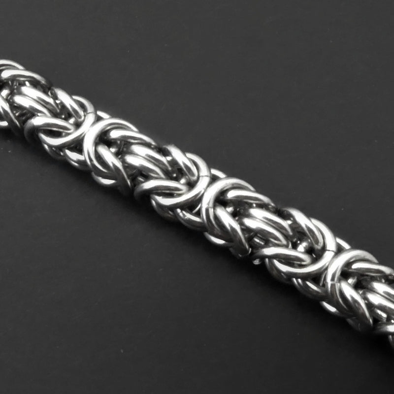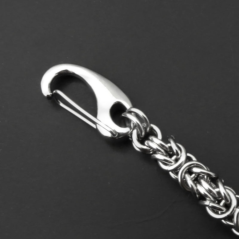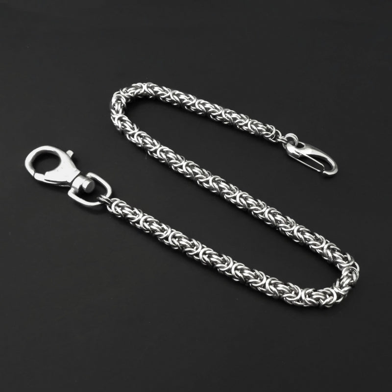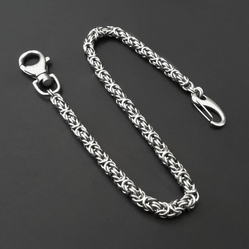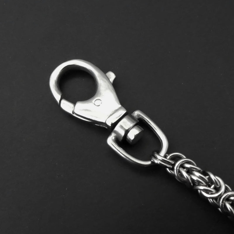 A handcrafted wallet chain, constructed with saw-cut stainless steel rings using the Byzantine weave, plus stainless steel attachments at each end (one lobster swivel clasp and one self-closing clip).