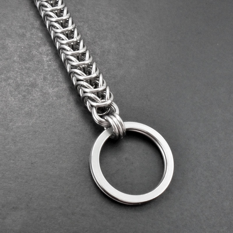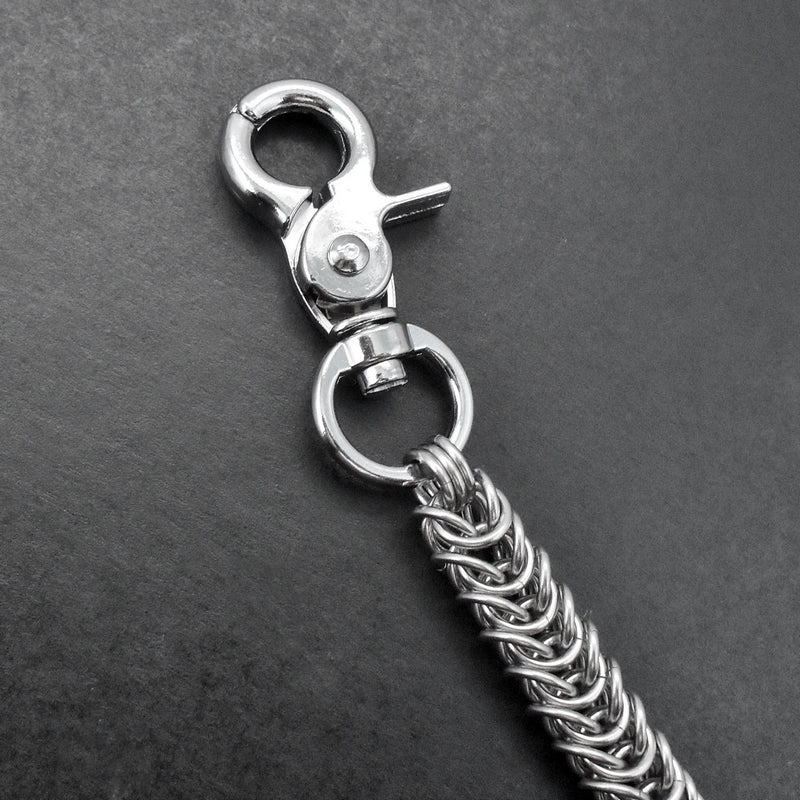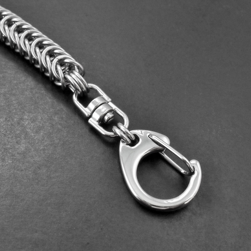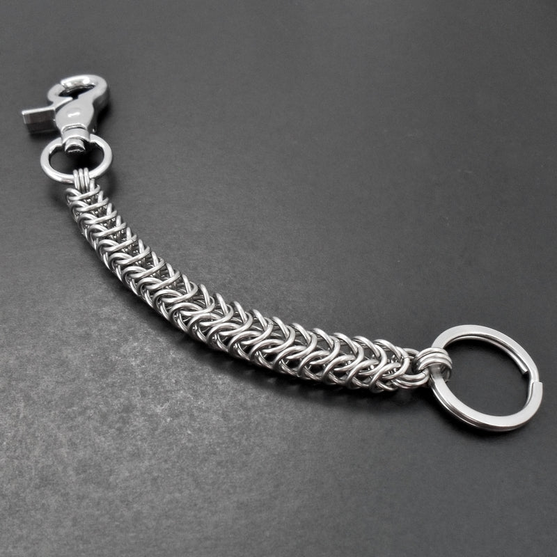 A short, handmade wallet or key chain, constructed from premium quality stainless steel using the Box chain mail weave, with a lobster swivel clasp attached and customisable with your choice of a key ring or snap clip and swivel clasp.