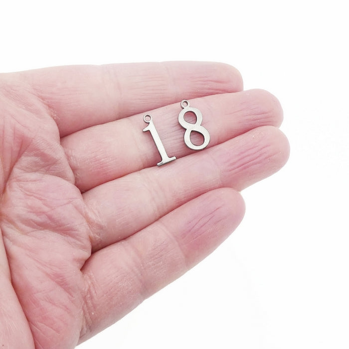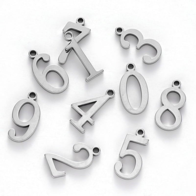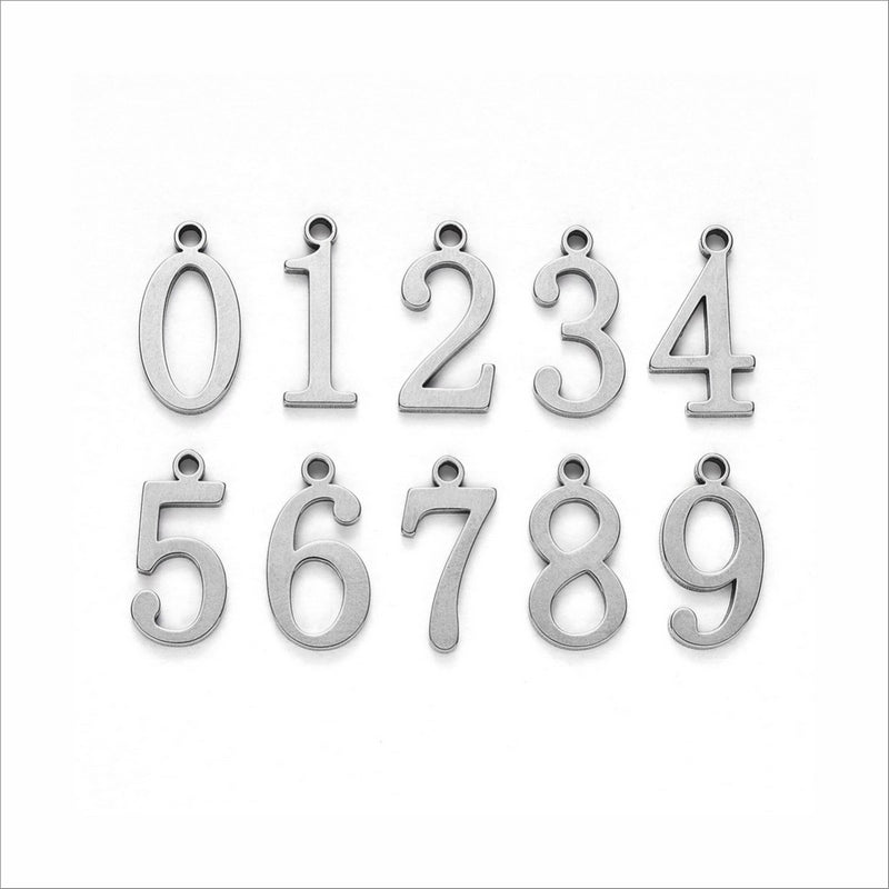 Two full sets of stainless steel number charms, (packages will contain 2 each of the numbers 1, 2, 3, 4, 5, 6, 7, 8, 9, 0).