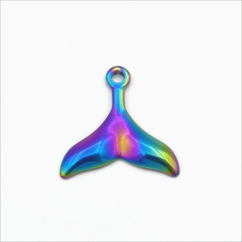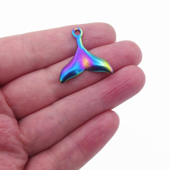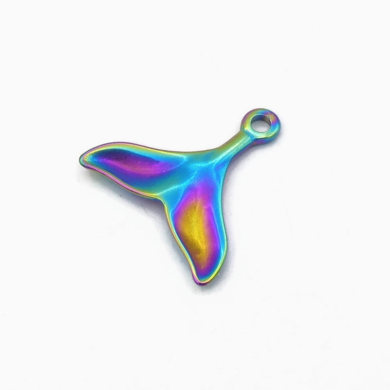 Two stainless steel mermain or whale tail pendants, anodized in an array of bright colours. They are hollow-backed and have smooth, semi-polished finish.