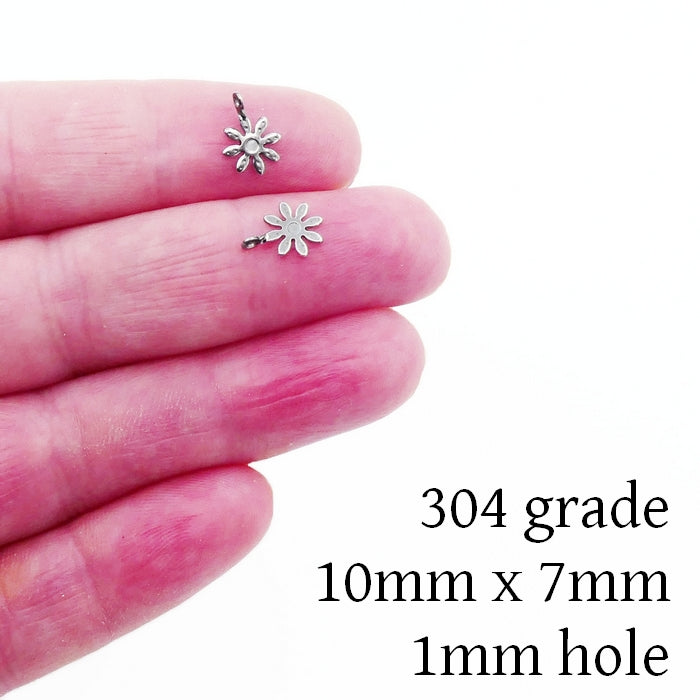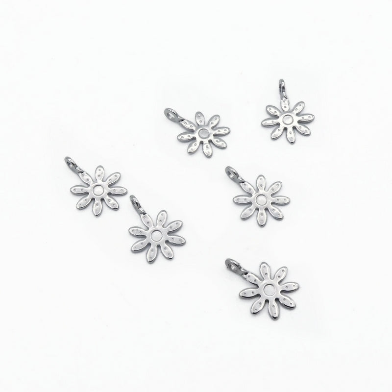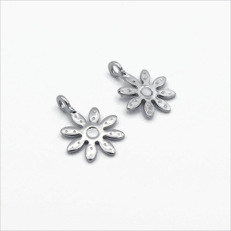 25 small flower charms featuring 8 petals, each lightly textured with small dots, with a round indent at the centre that can be left as-is or customised with a rhinestone or other materials (a 1mm flatback rhinestone will fit).