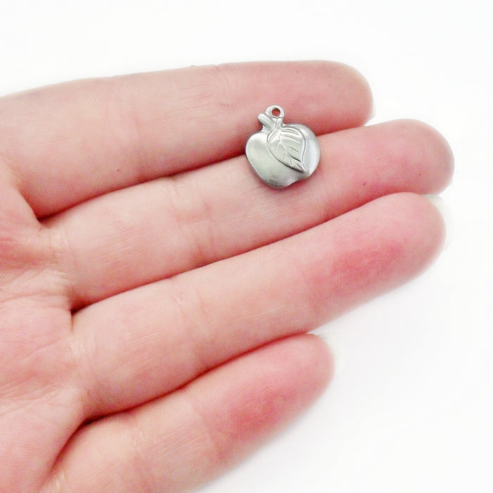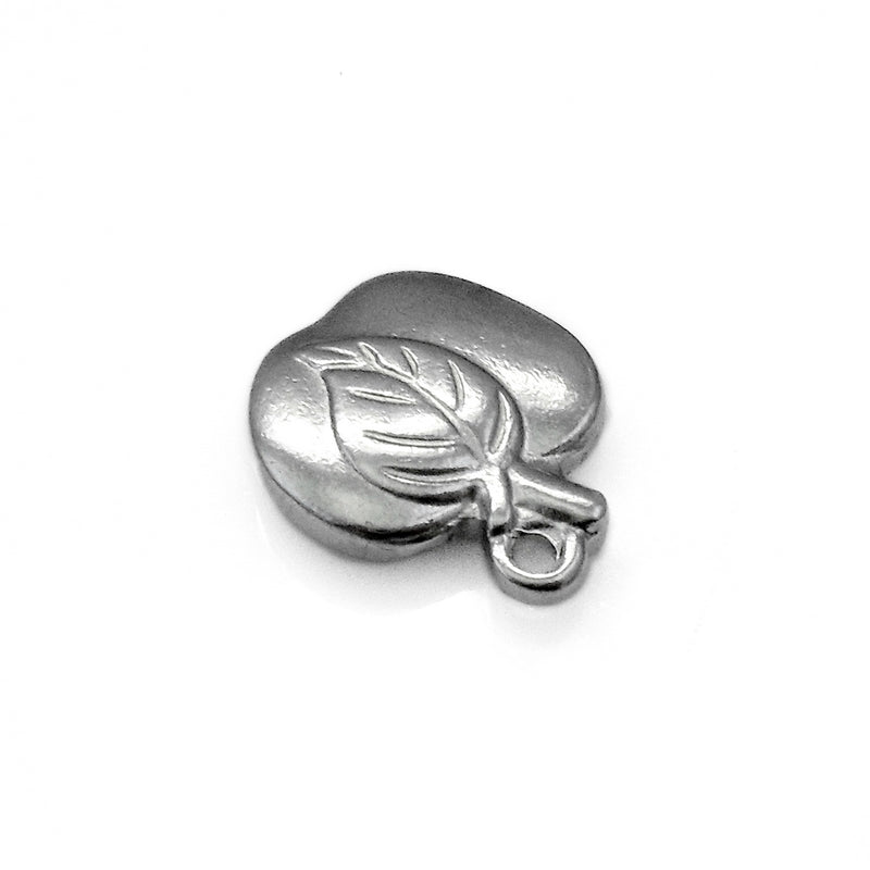 5 solid, cast stainless steel double-sided apple charms, dark silver-grey in tone with a smooth, semi-polished finish - as solid steel, these are heavier than the average metal charm of similar size.