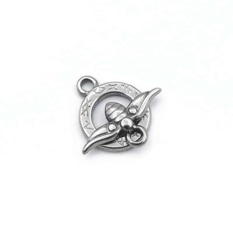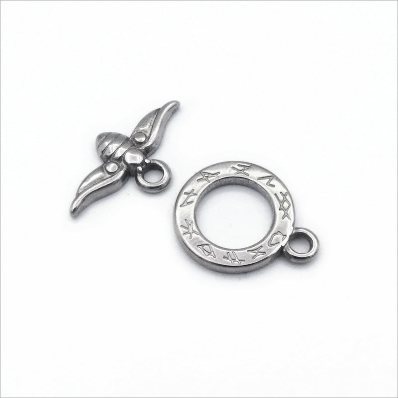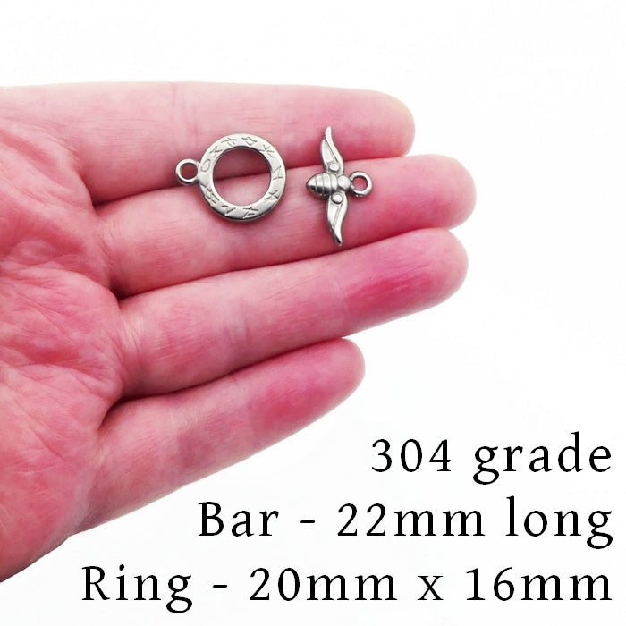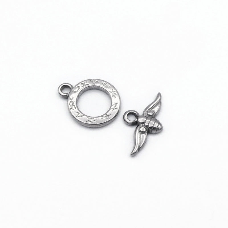 Two stainless steel toggle clasp sets, featuring a bee-shaped bar and an etched pattern on the ring.