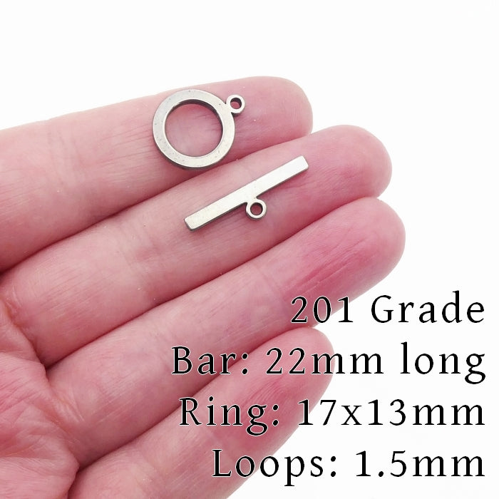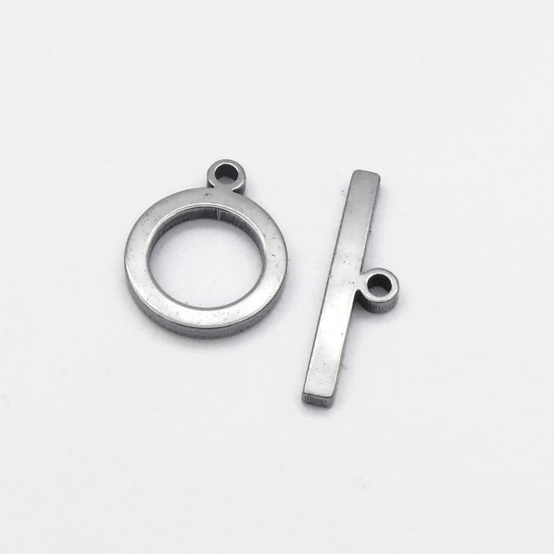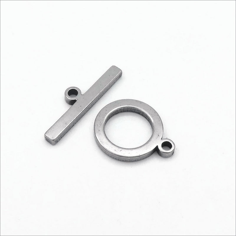 Three stainless steel toggle clasp sets with a squared shape, and with each component made from a single piece of solid steel, making them suitable for heavier duty usage.