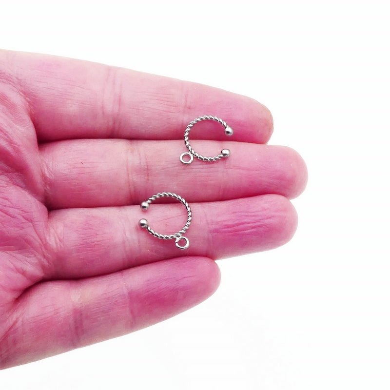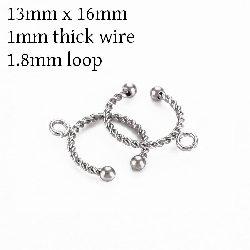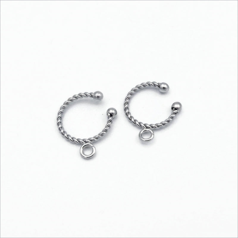 A simple earring cuff made from twisted stainless steel wire that is capped at each end, with a soldered loop for attaching additional components.