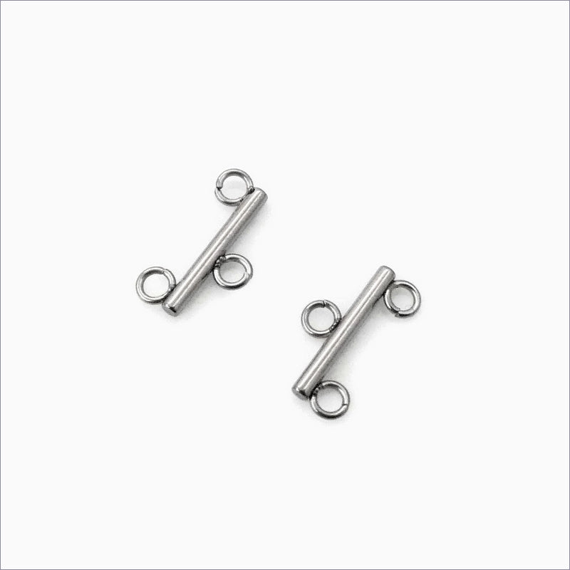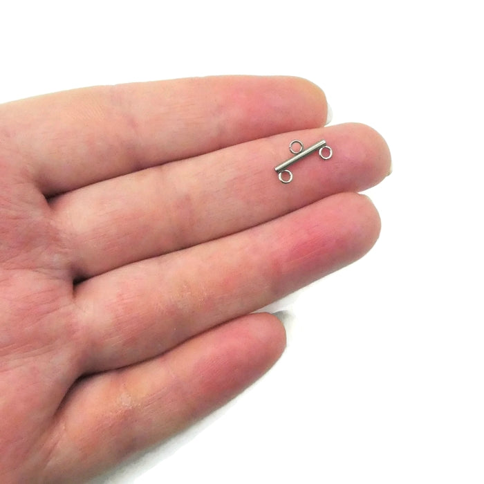 Ten bar connectors with loops, allowing you to quickly create a single attachment loop for multi-strand pieces, or for use as chandelier drops.