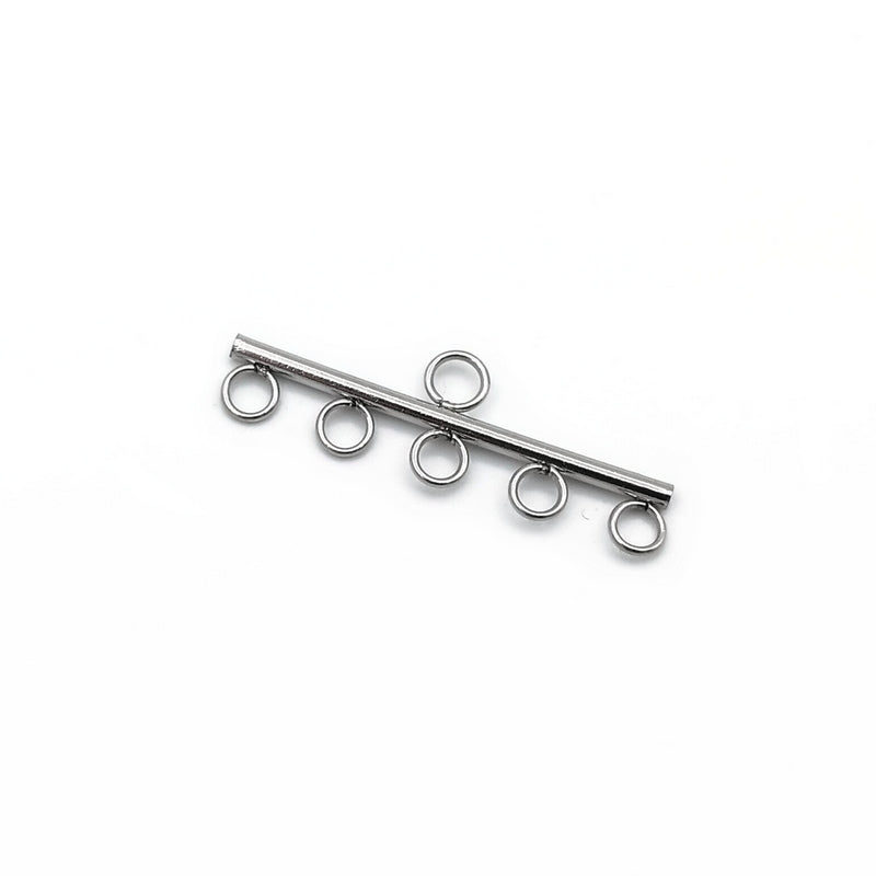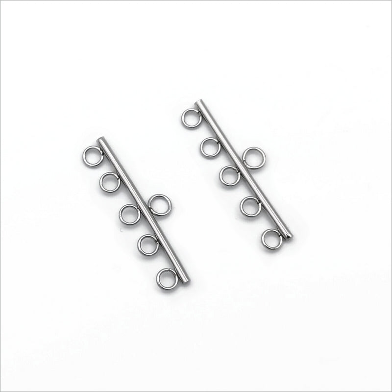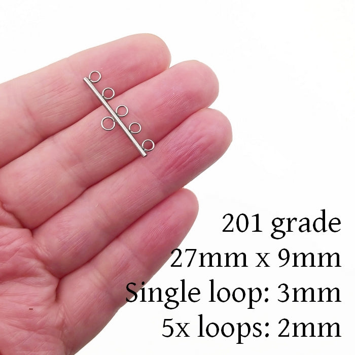 Ten bar connectors with loops, allowing you to quickly create a single attachment loop for multi-strand pieces, or for use as chandelier drops. The lingle loop has an inner diameter of 3mm, while the remaining 5 loops have a 2mm diameter.