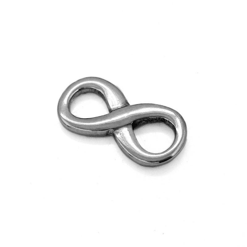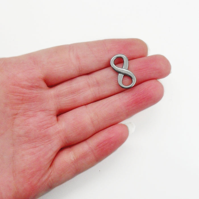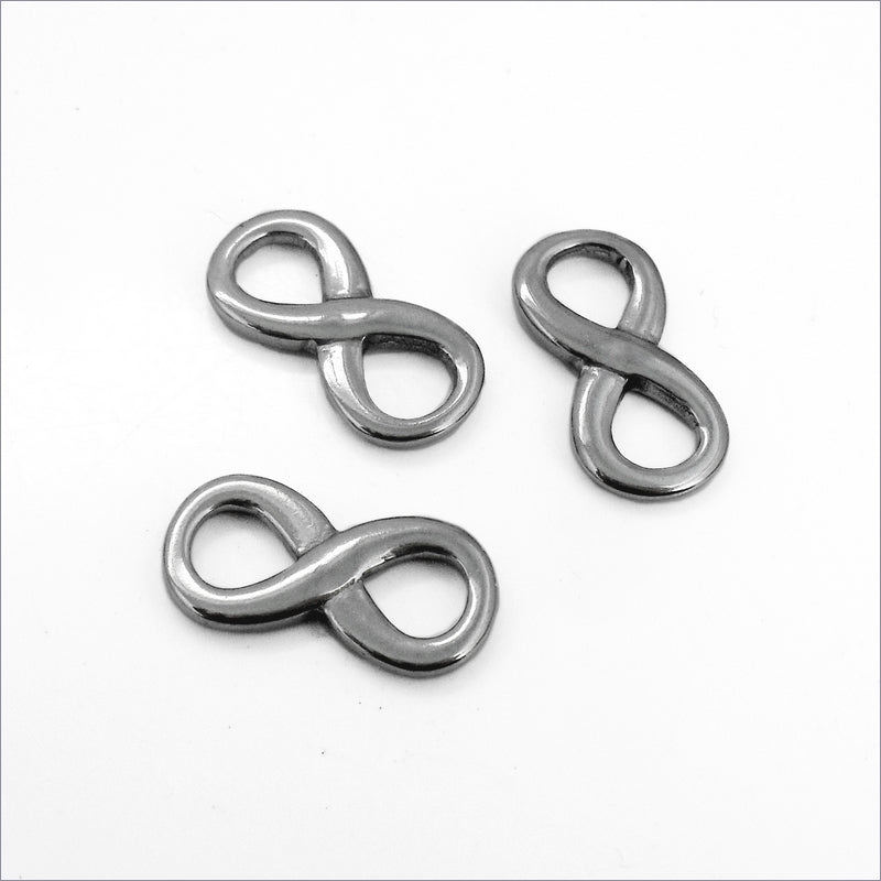 Five small, solid stainless steel infinity connectors, dark silver in tone with a semi-polished finish.