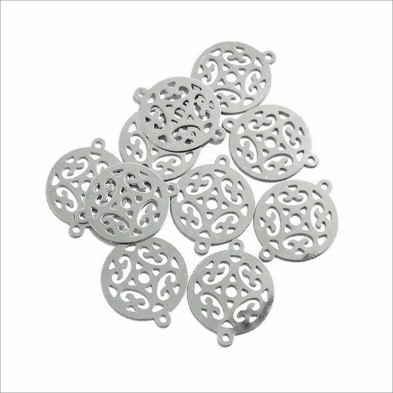 20 ornate, round stampings, made from stainless steel, with a shiny and polished finish. These are paper thin but quite strong.