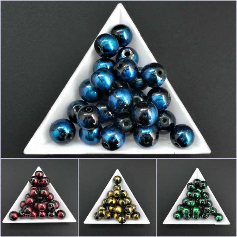 25 glossy black glass beads with a splash of metallic colour, measuring 10mm x 9mm.