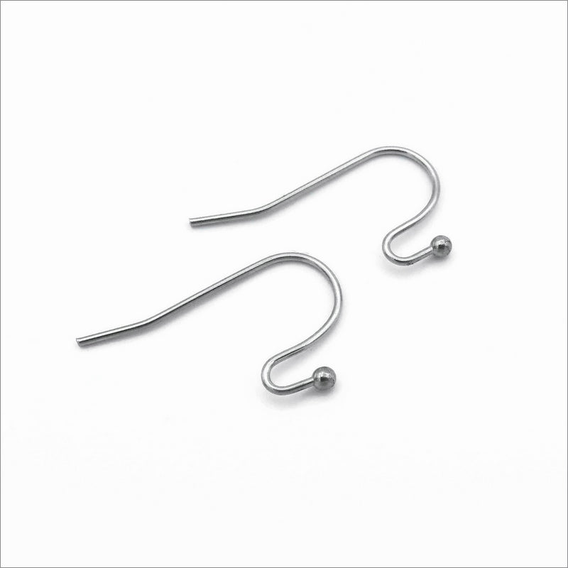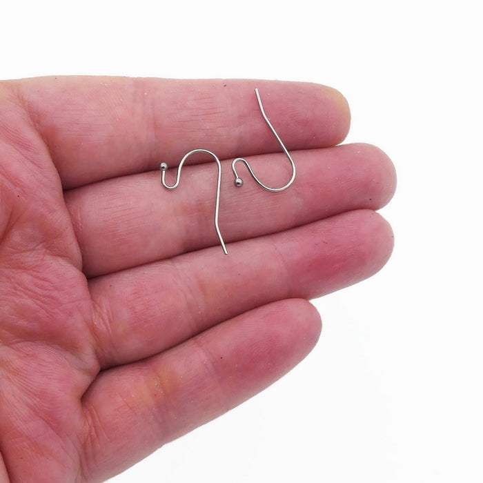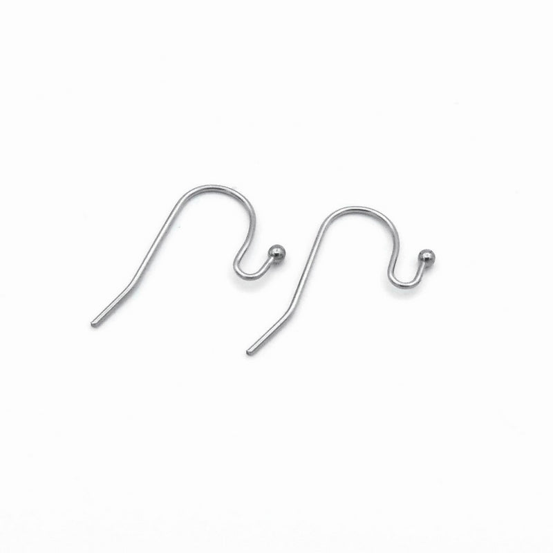 25 pairs of stainless steel French hook earwires, with an open loop and ball-pin end. Attachments can be placed in the nook and the loop gently closed to secure them in place.