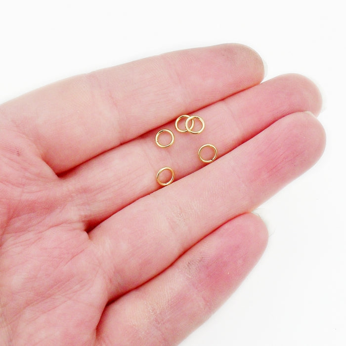 200 machine cut stainless steel jump rings, vacuum plated with a ceramic coating for a durable yellow gold tone finish.