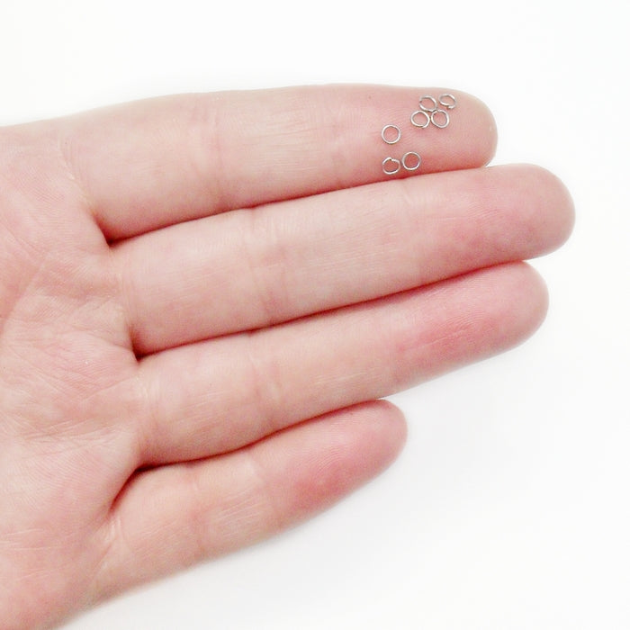 1000 extra small, fine gauge stainless steel jump rings, measuring 3mm (outside diameter), perfect for small, light duty and non-load-bearing use.