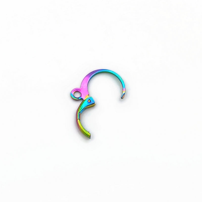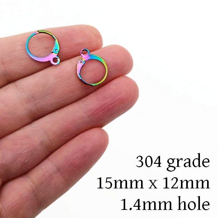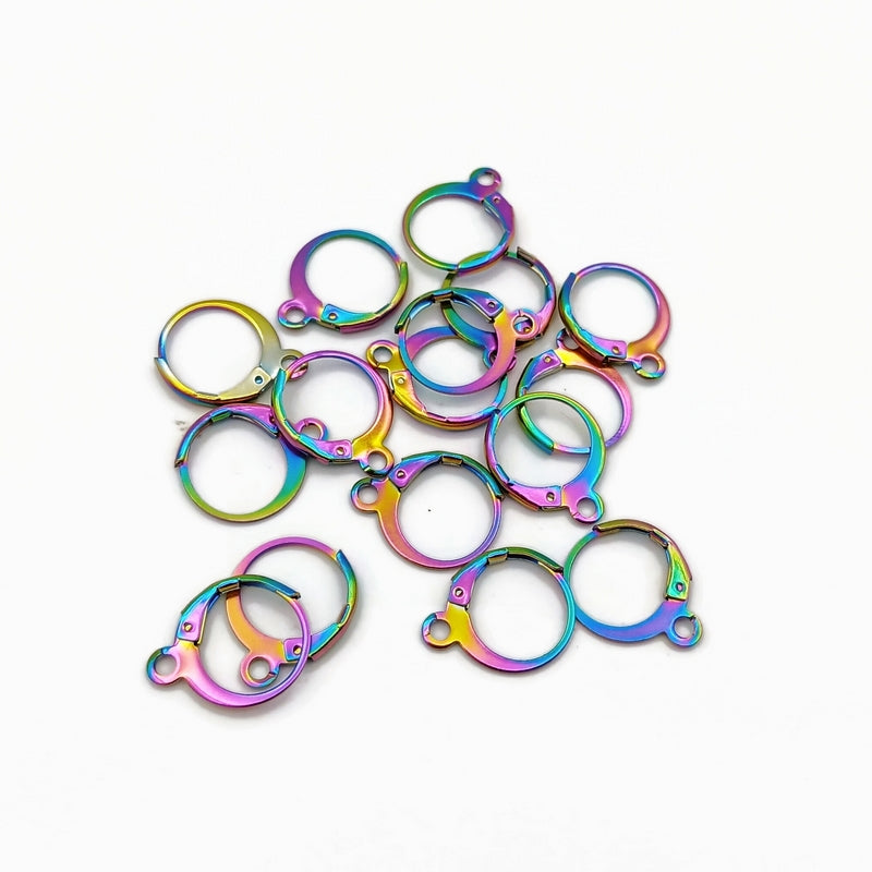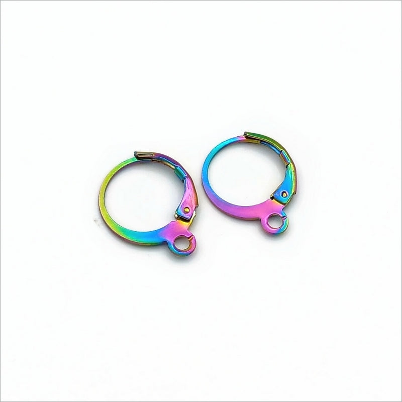 10 pairs of stainless steel round leverback earring hooks, with a rainbow finish.