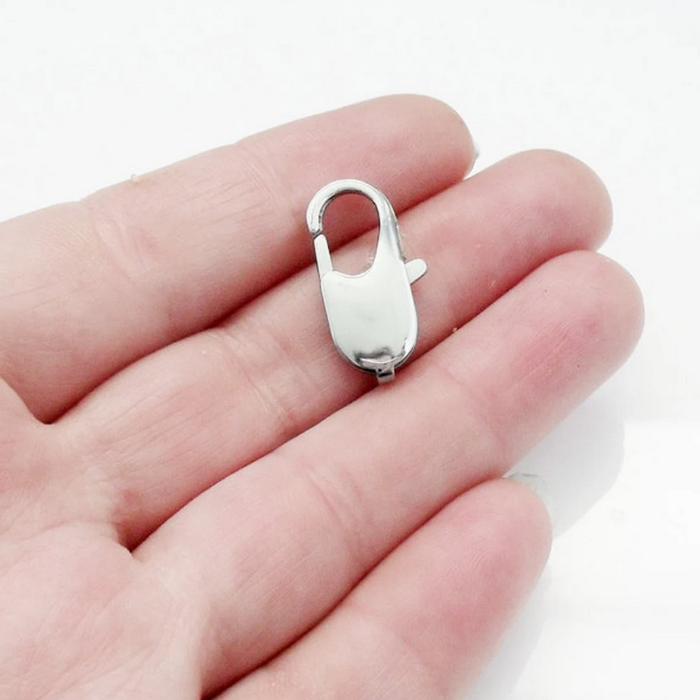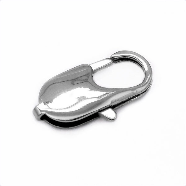 3 large-sized lobster clasps, in a rectangle shape, and with a polished finish. The attachment loop will accommodate wire or rings up to 14 gauge (1.6mm thick)
