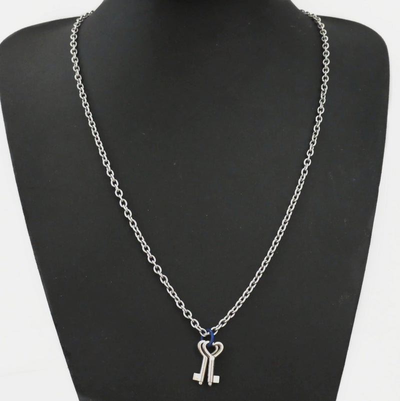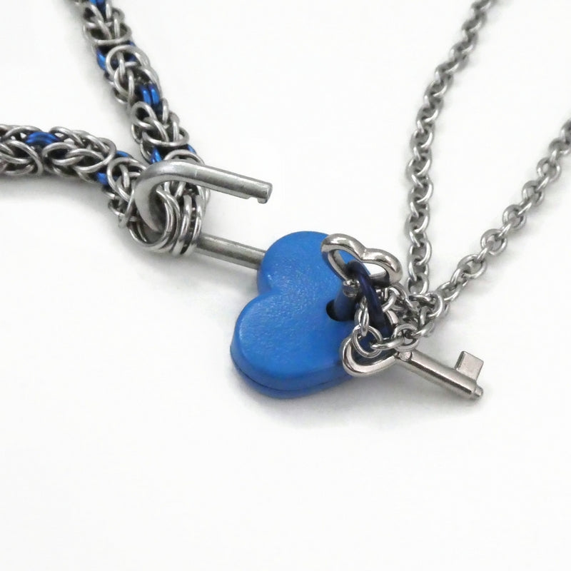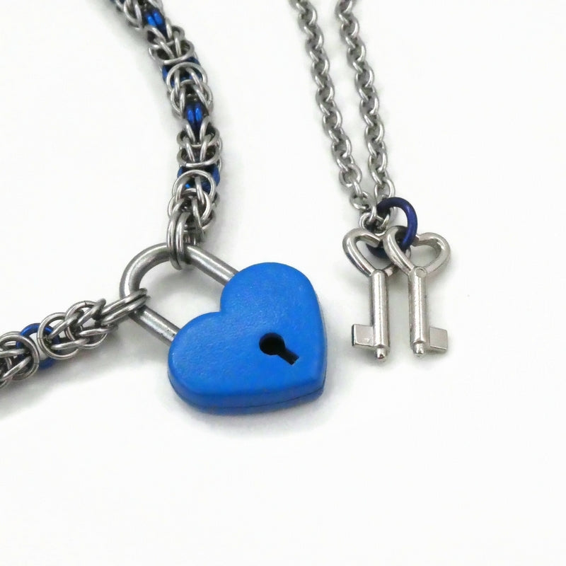 A working heart-shaped padlock (zinc alloy) painted blue, paired with a handmade stainless steel and blue aluminium persiantine chain. The accompanying keys are attached to a 60cm stainless steel cable chain necklace for a complete set.