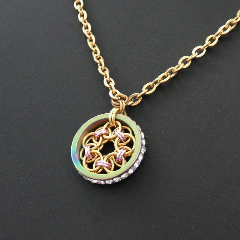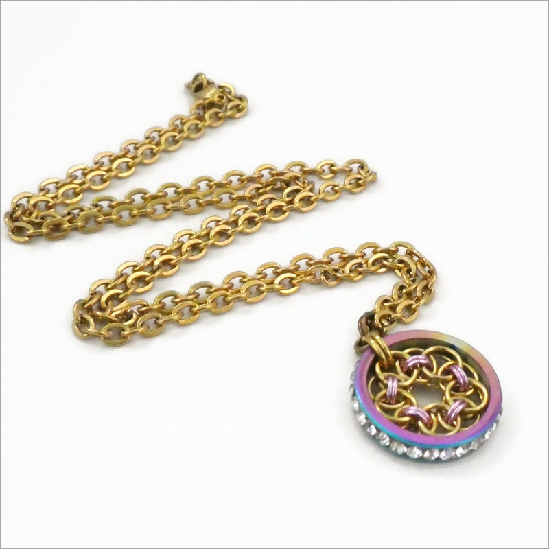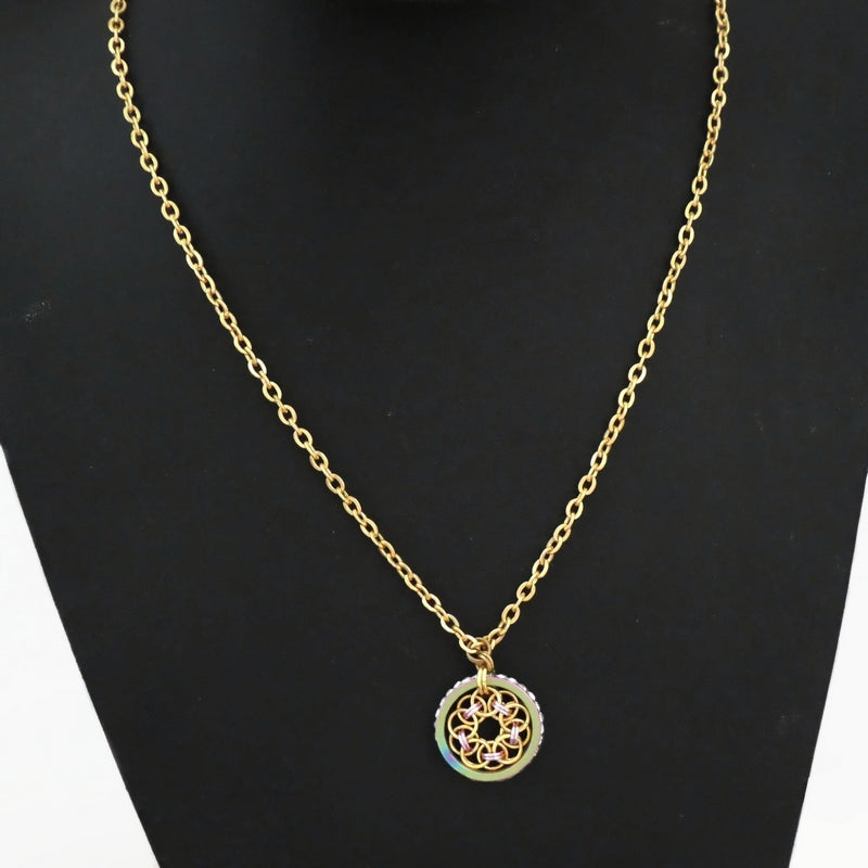 A handmade pink and glold helm flower, framed by a rainbow ring studded with rhinestones around the outside, with a 60cm gold tone stainless steel chain necklace.