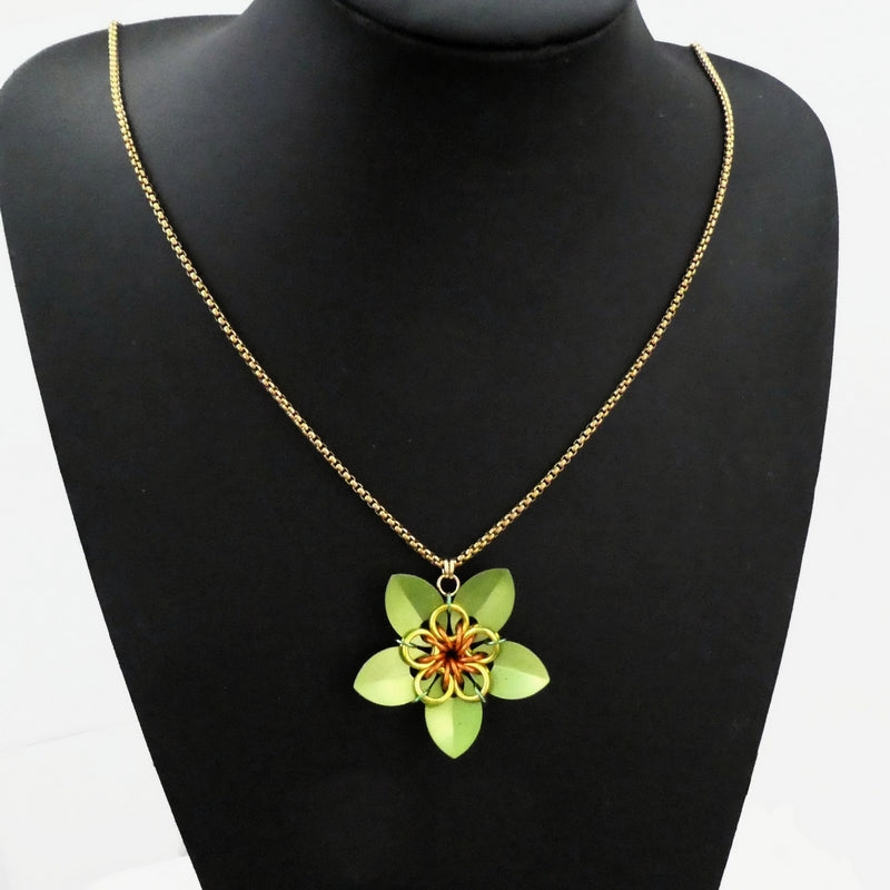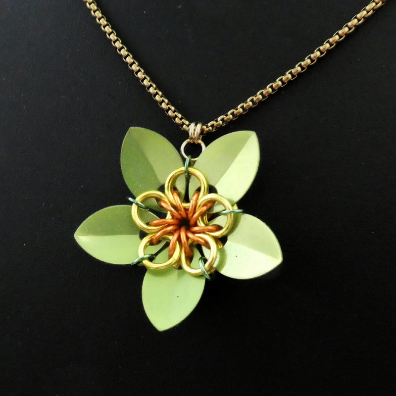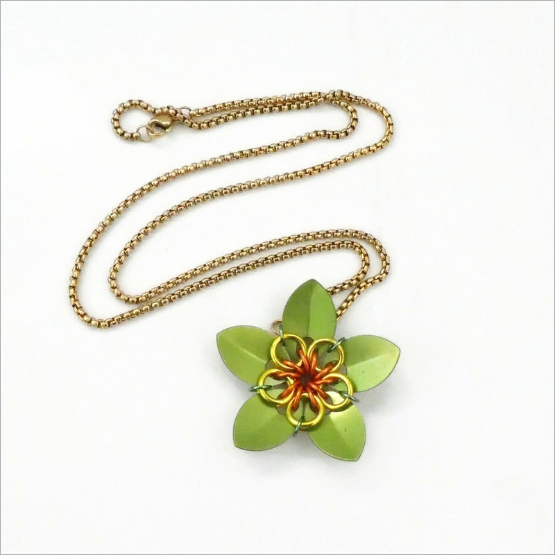 A handmade scale flower in summer citrus colours, paired with a gold tone 60cm stainless steel rolo chain - this particular design won't be replicated.