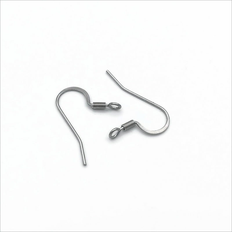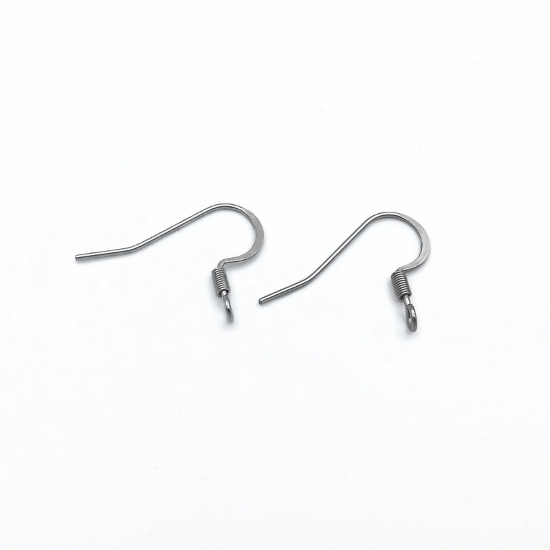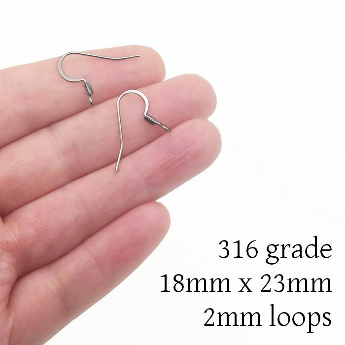 25 pairs (50pcs) of stainless steel earring hooks, these feature flattened wire around the curve and front facing loops, with a coil on the stem.