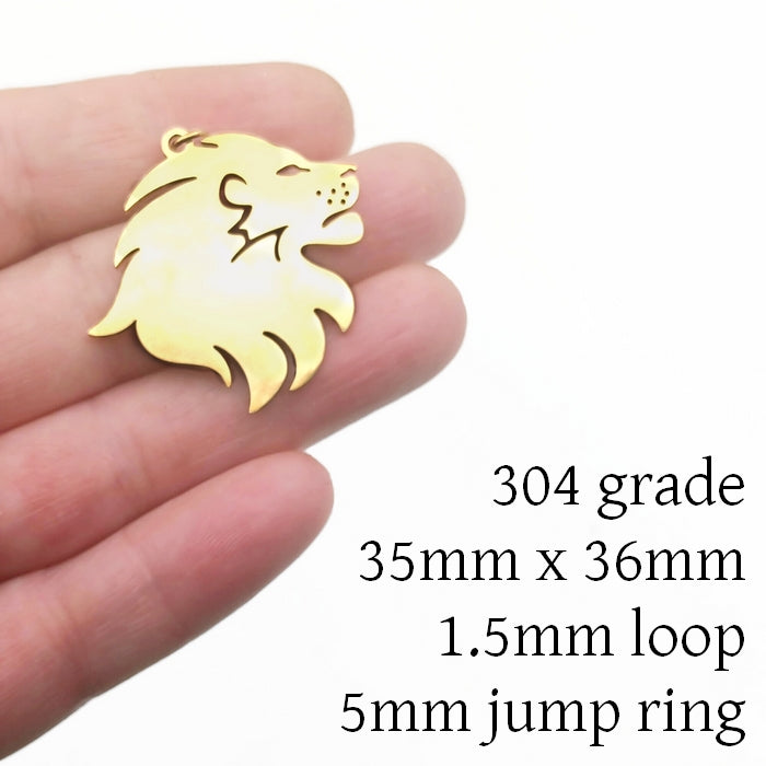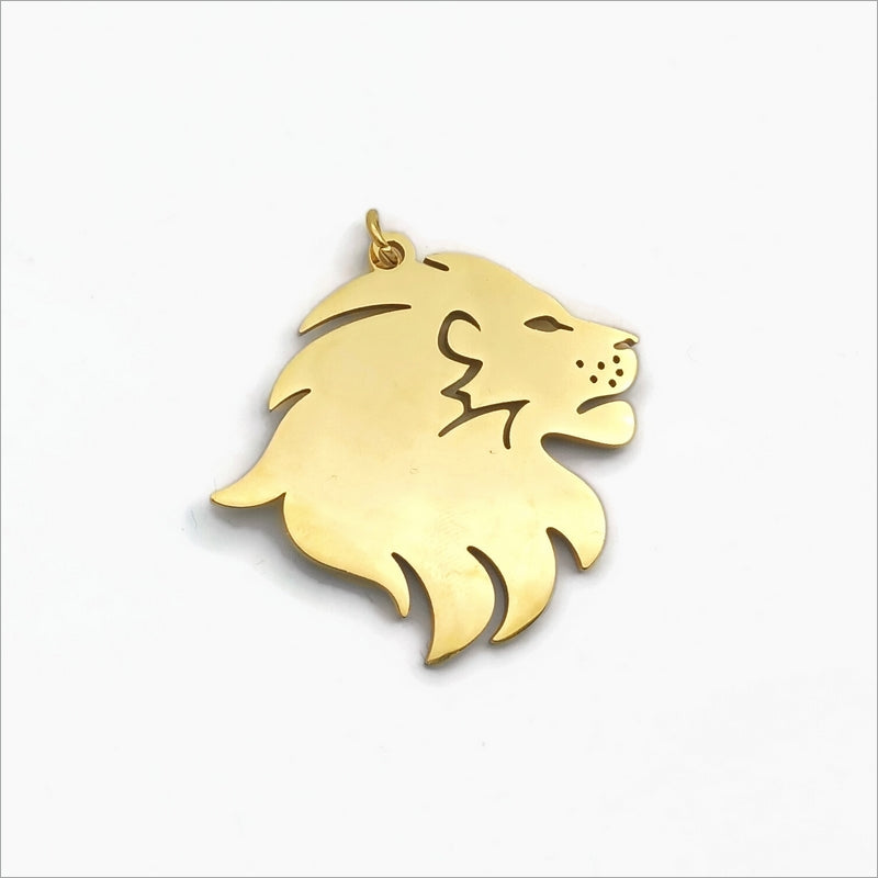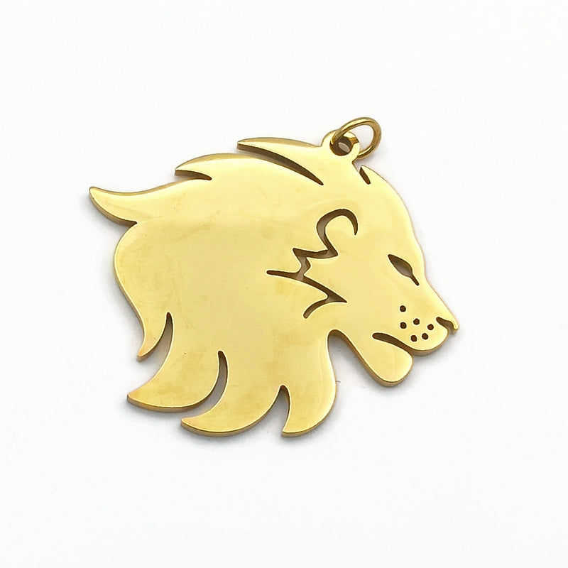 Three flat, laser-cut lion pendants, electroplated with a durable gone tone with a polished finish.