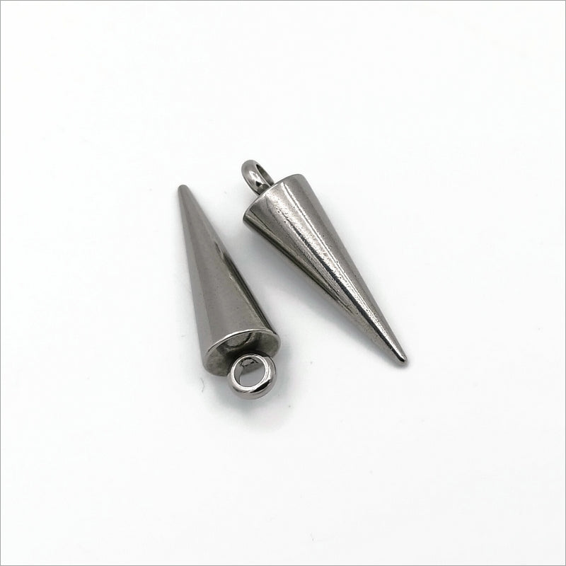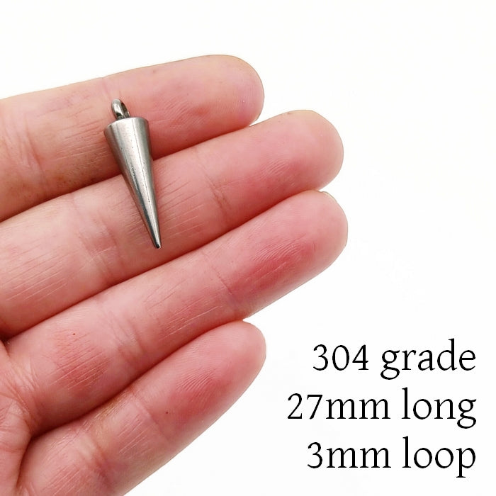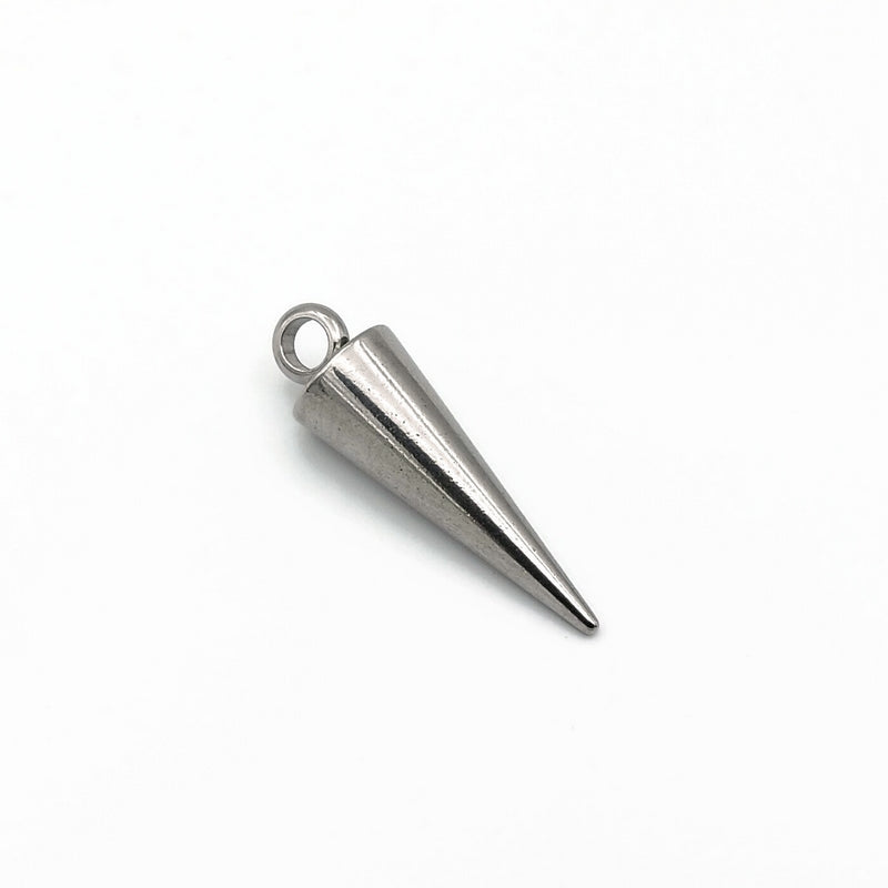 Three spike pendants, made from a single, solid cone-shaped piece of steel with a soldered bail loop. The spike is 7mm wide at the top, tapering to 1mm with a rounded tip.