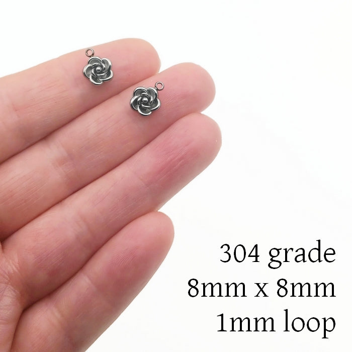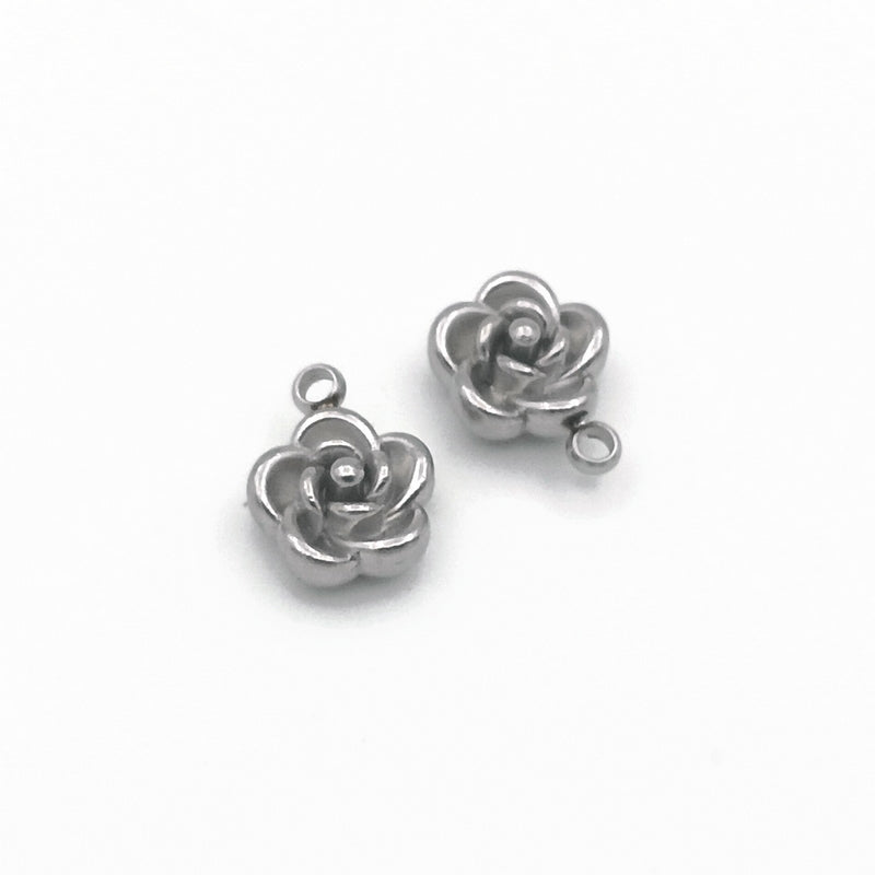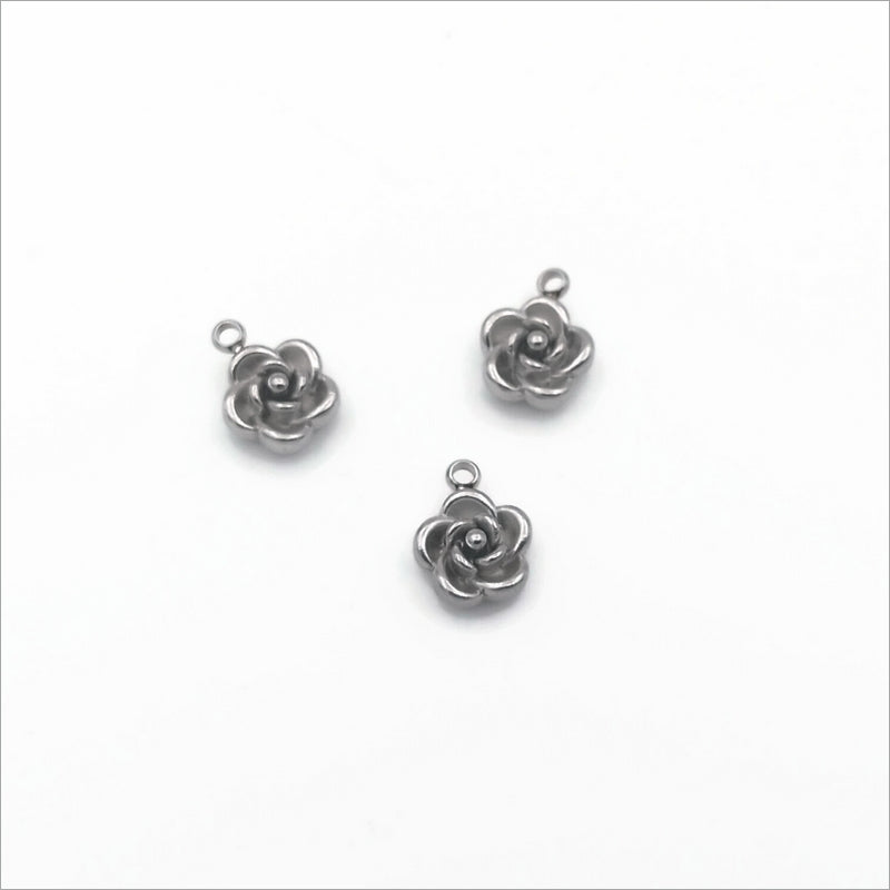Five small, solid stainless steel rose charms, with a semi-polished finish