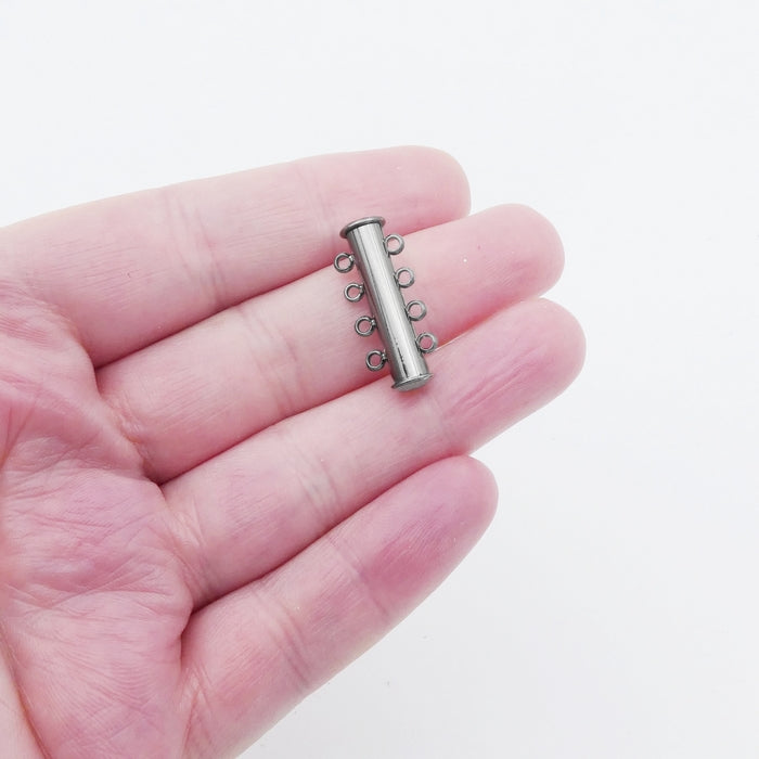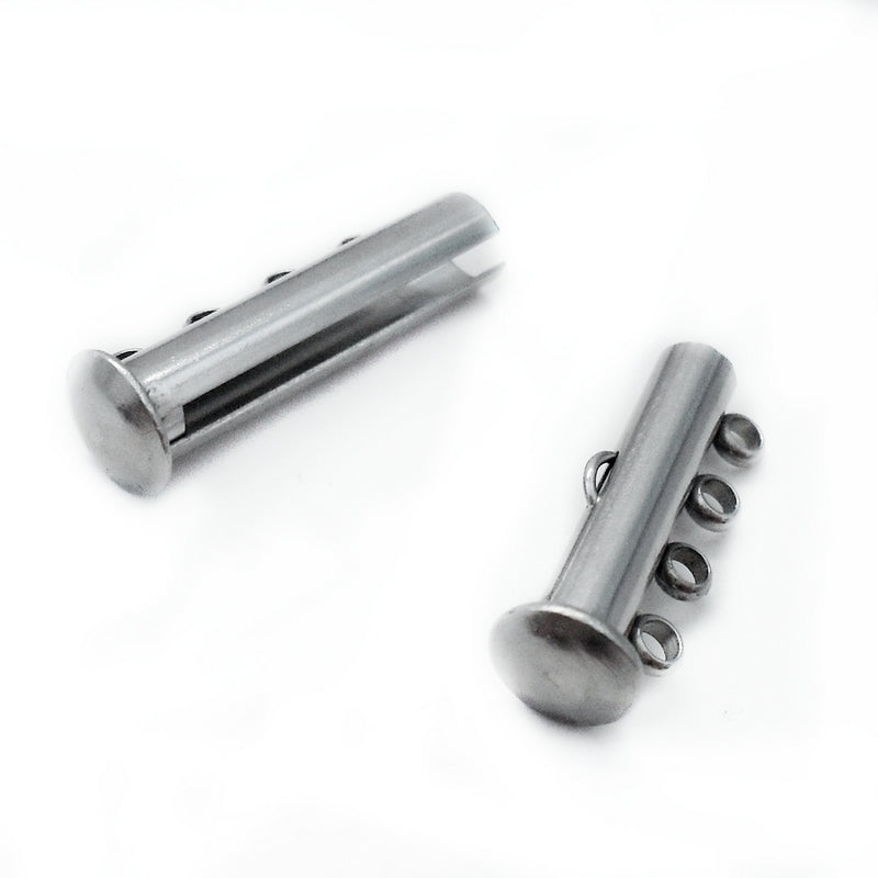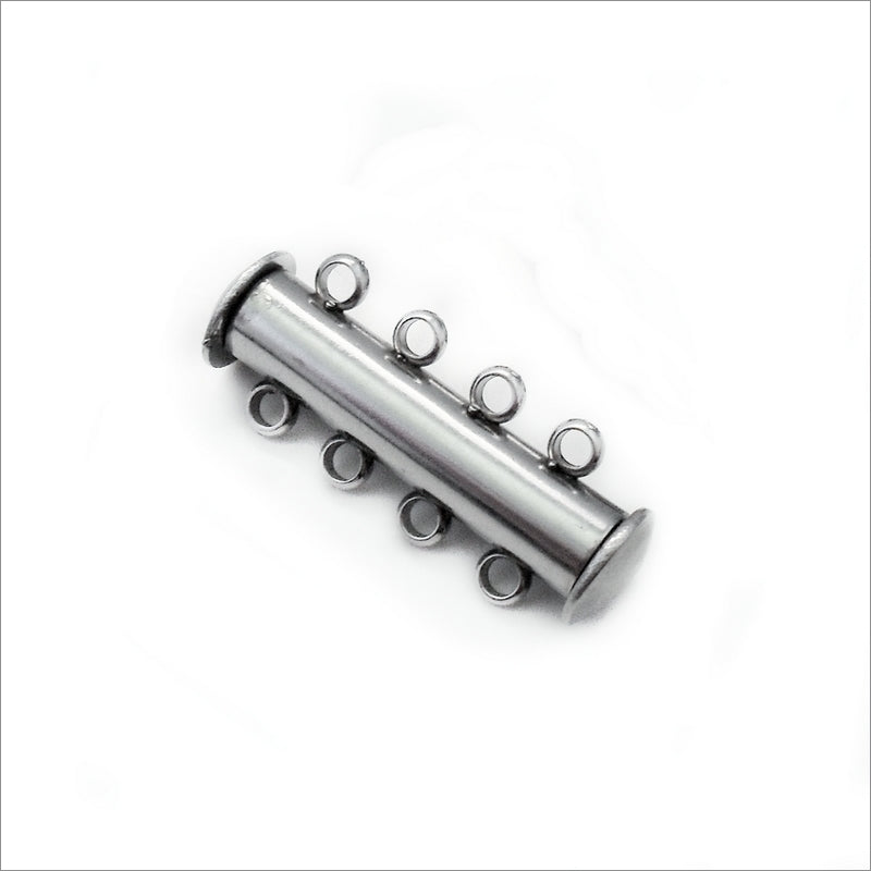 A stainless steel 4-strand slide clasp, with a magnet to help keep them fastened.