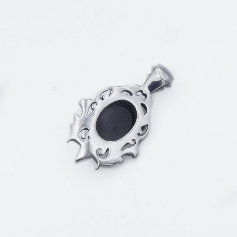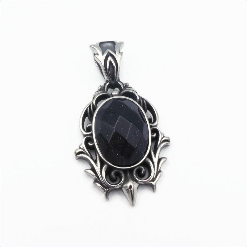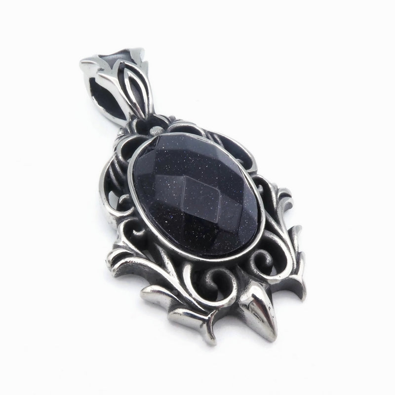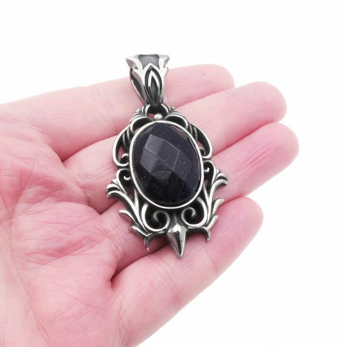 A large pendant featuring facted, sparkling blue goldstone set into an ornate surgical grade steel setting, with attached bail for stringing on to cord or chain.