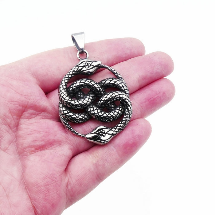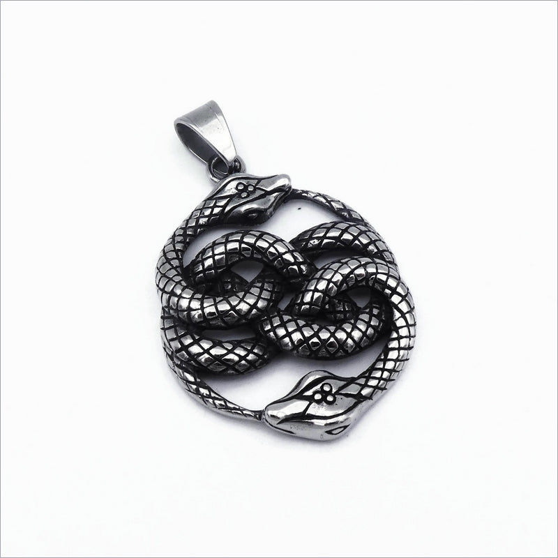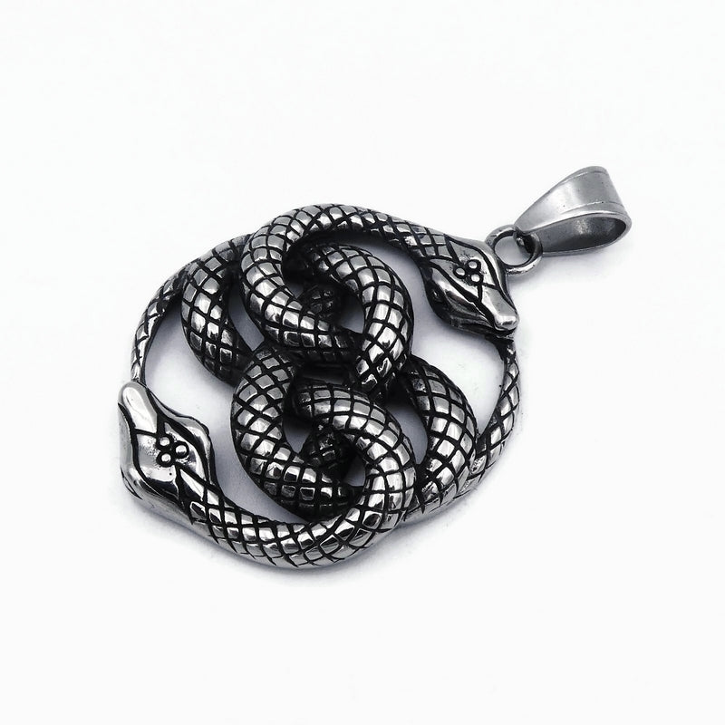 One Auryn pendant, featuring two entwined snakes, with an attached pendant bail ready for stringing on to chain or cord