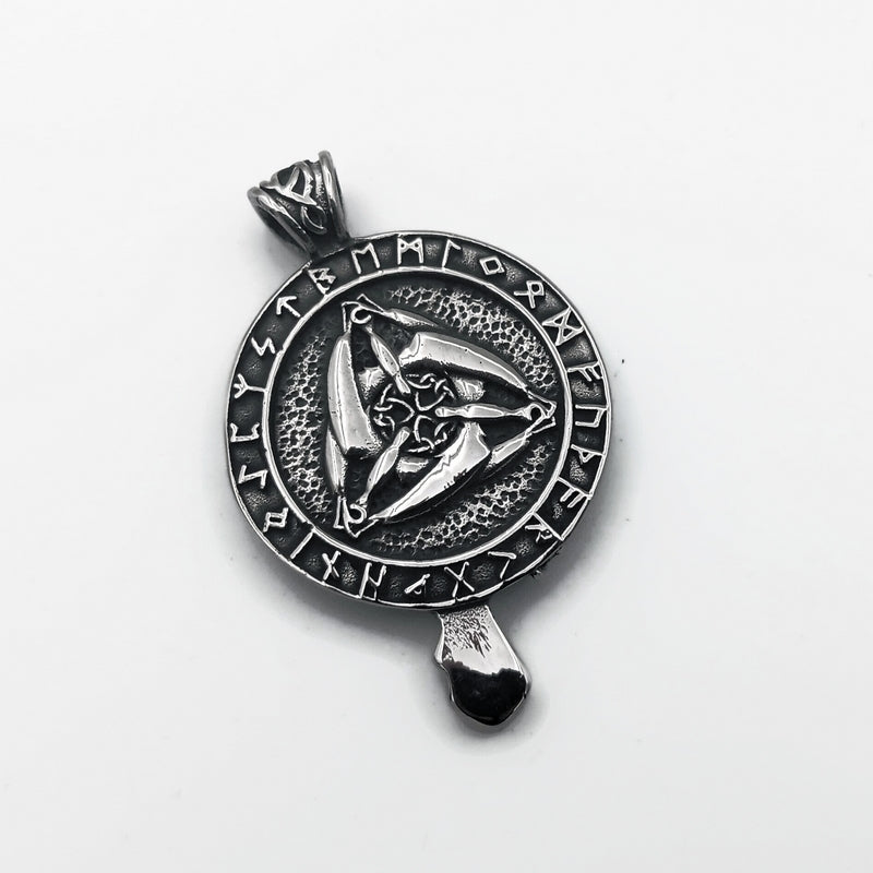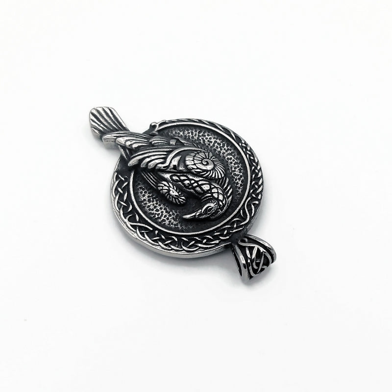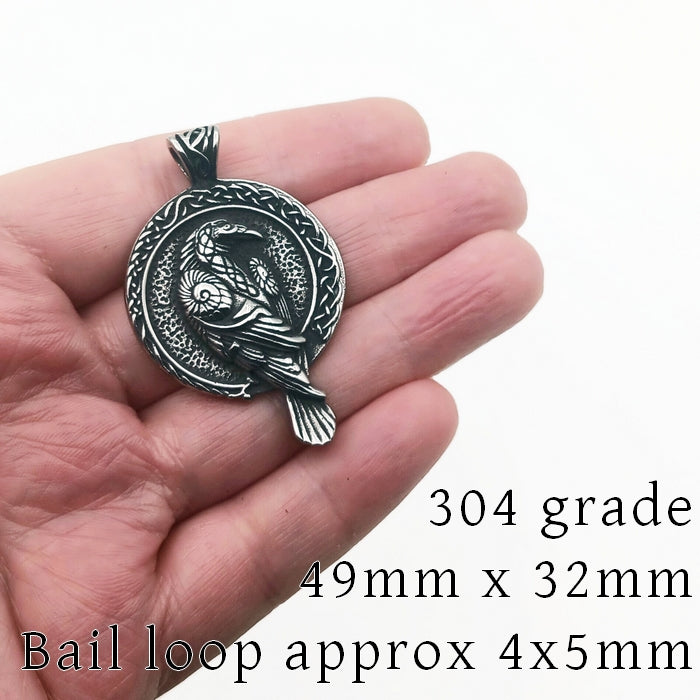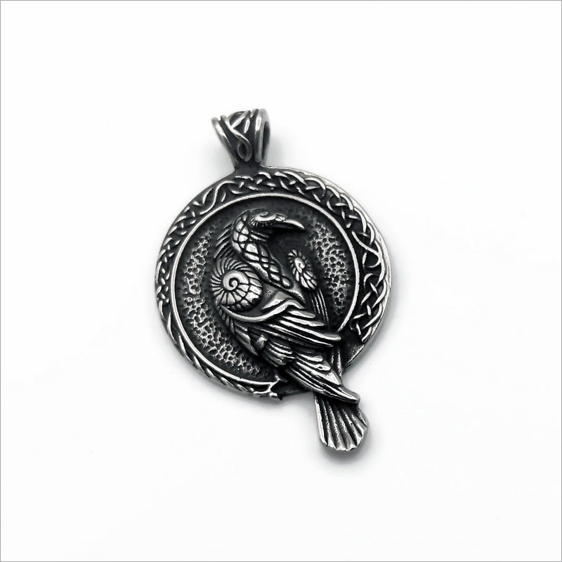 One stainless steel pendant, featuring a perched raven with Celtic detailing on the front, while the back features runes and a trinity triquetra knot. It has an attached bail for stringing on to cord or chain.