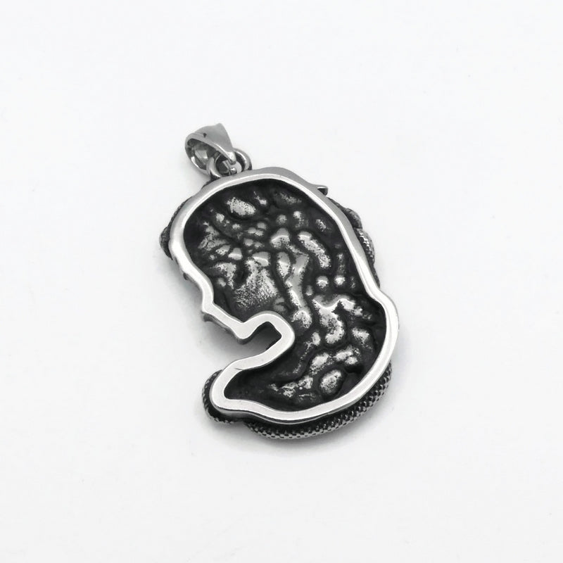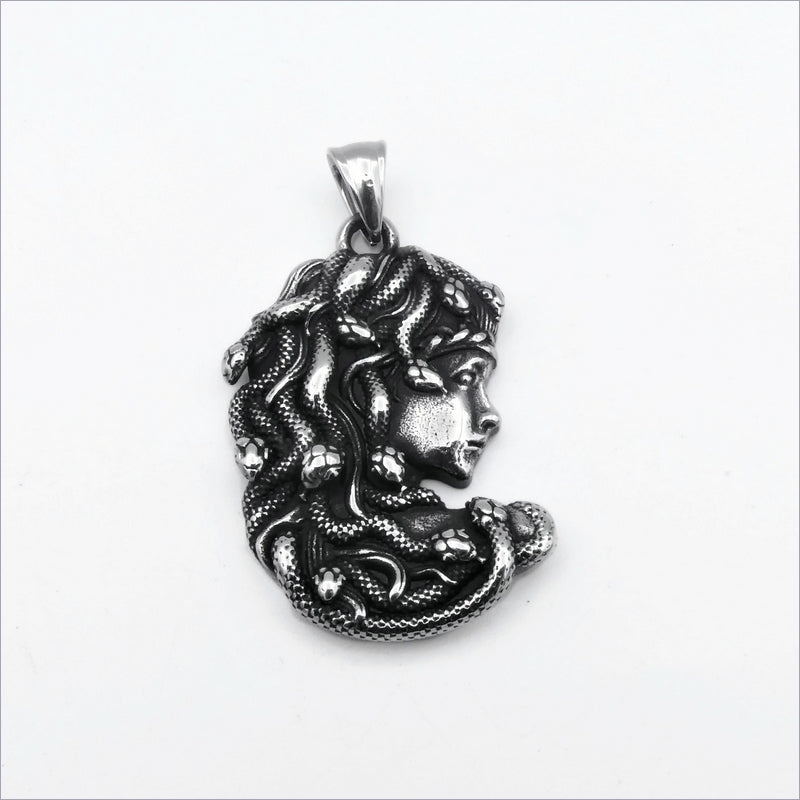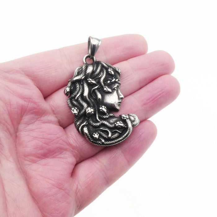 One stainless steel pendant of Medusa's head in profile, hollow-backed and with a bail for stringing onto chain or cord.