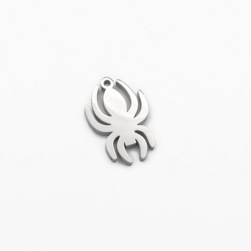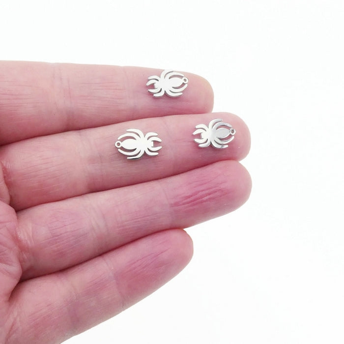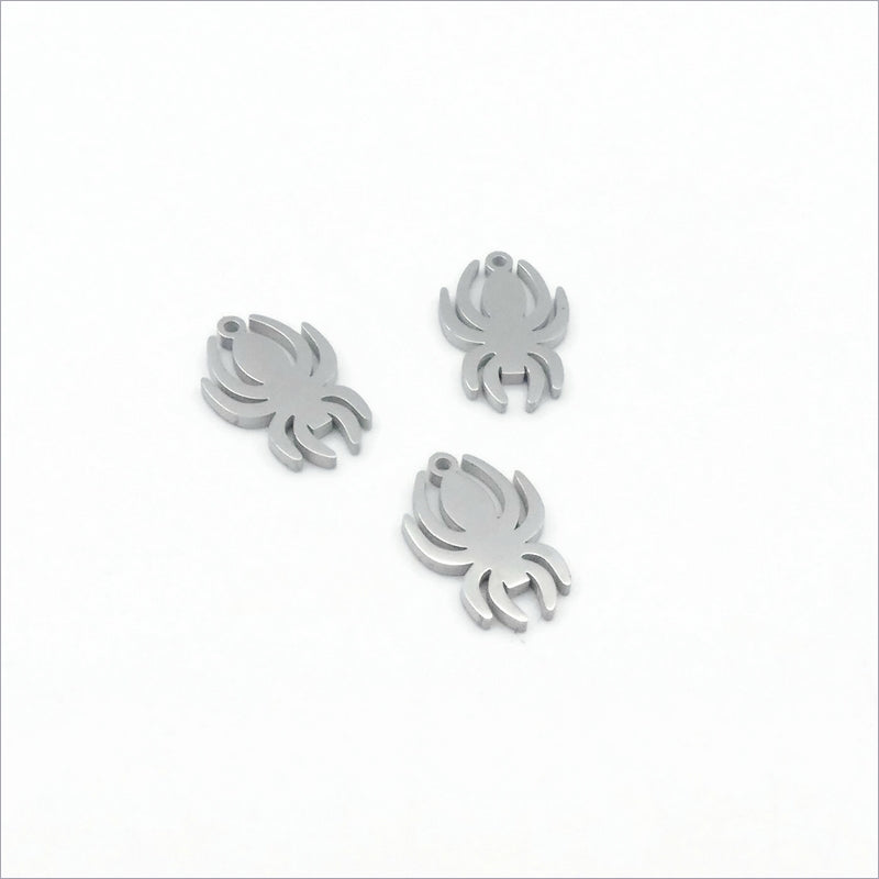 Ten flat stainless steel spider charms, with a semi-polished shiny finish.