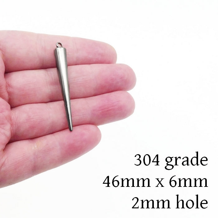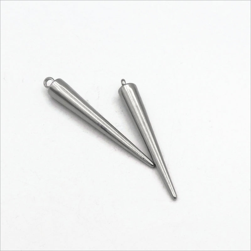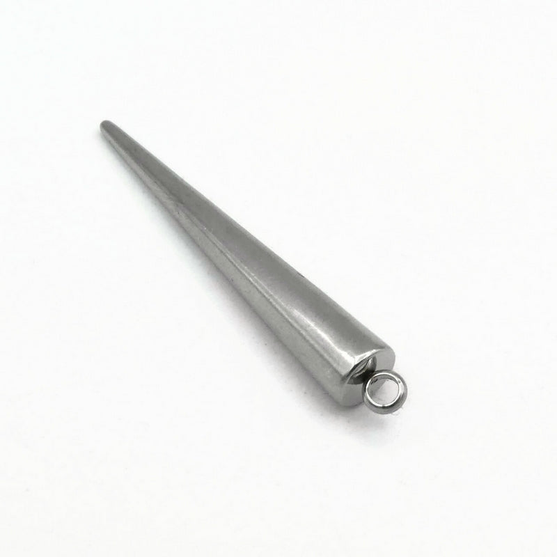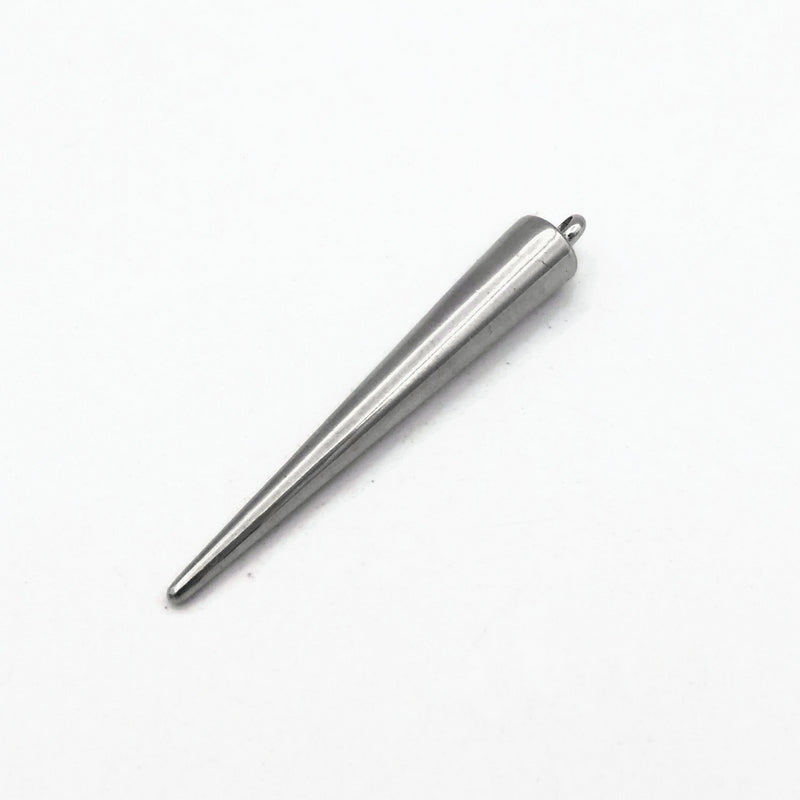 Two large spike pendants, made from a single, solid cone-shaped piece of steel with a soldered bail loop. The spike is 6mm wide at the top, tapering to 1mm with a rounded tip.