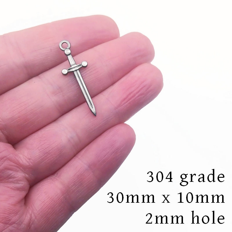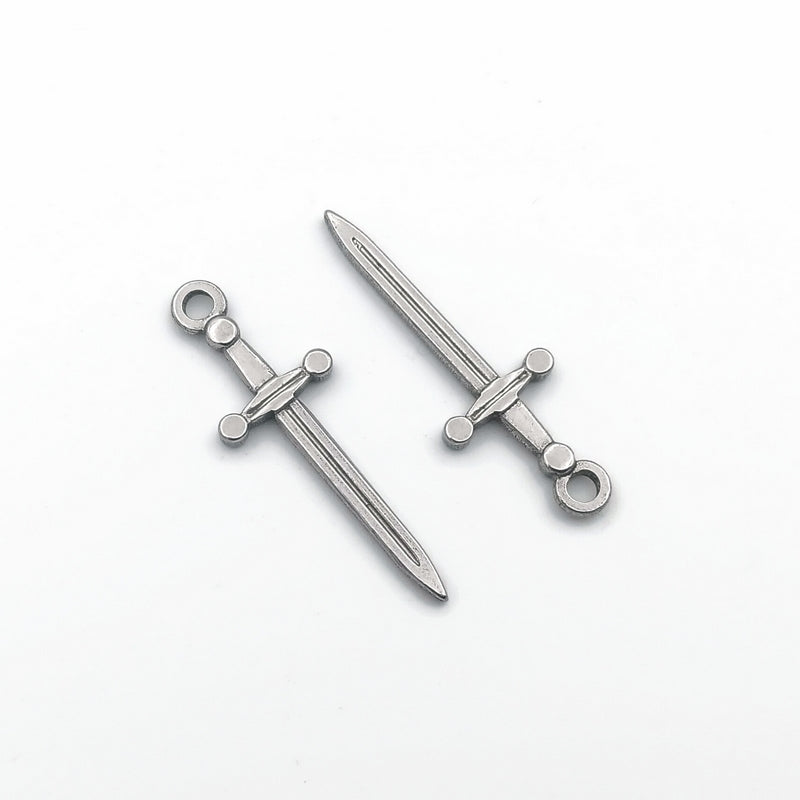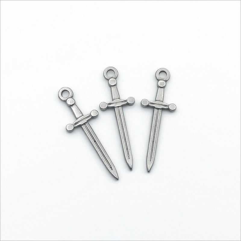 Five solid stainless steel sword pendants, double-sided and with simple detailing.
