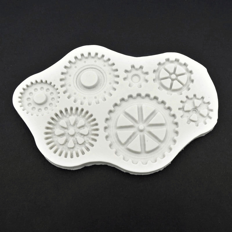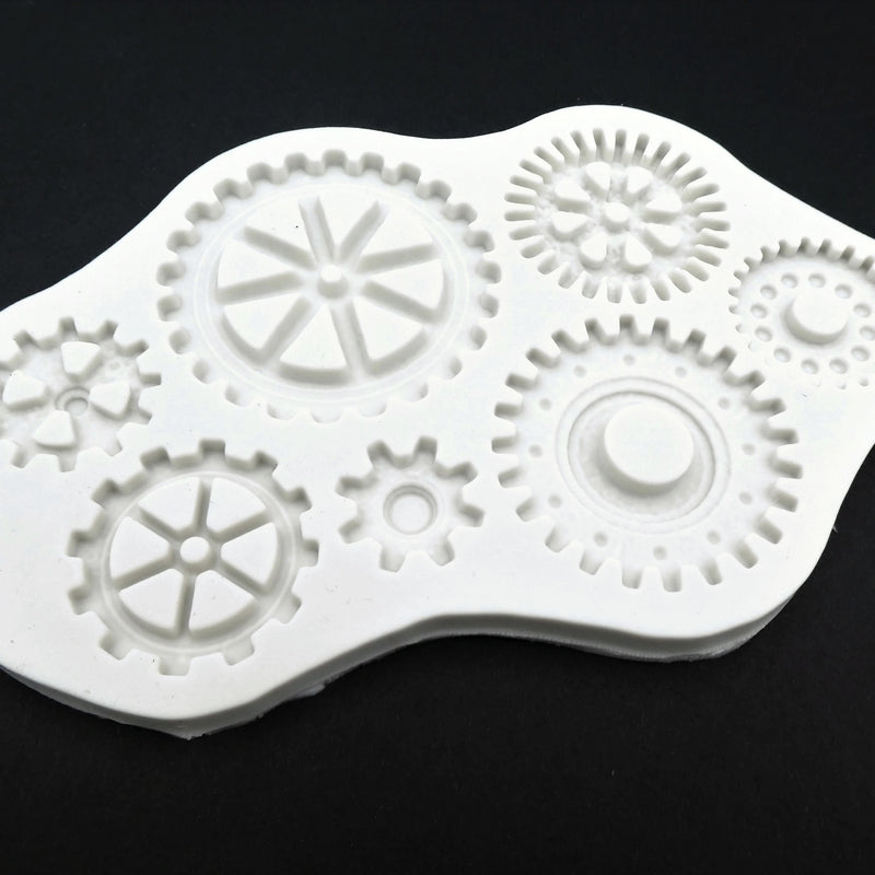 One silicone mould for resin and clay, featuring various cog and gear designs, perfect for steampunk or other mechanical designs - this will create large pieces, the smallest has a diameter approximately 22mm, while the largest is approximately 50mm.