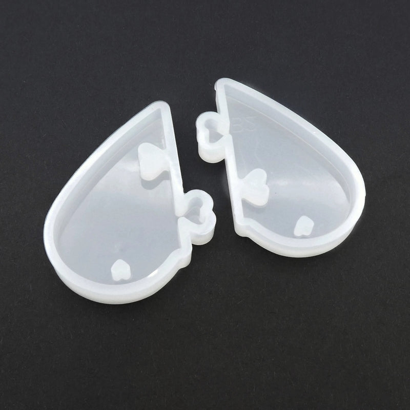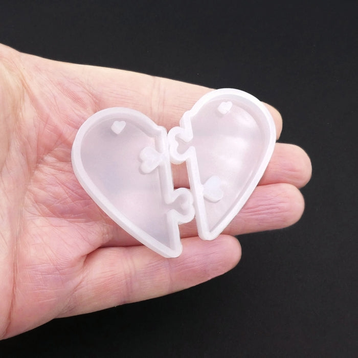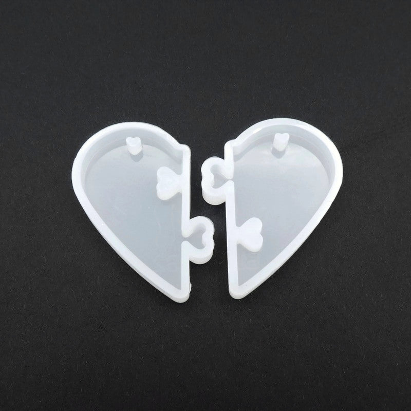 Two silicone moulds to create a matching heart puzzle piece set, with heart-shaped pins to create a hole for pendant bails or other stringing materials.