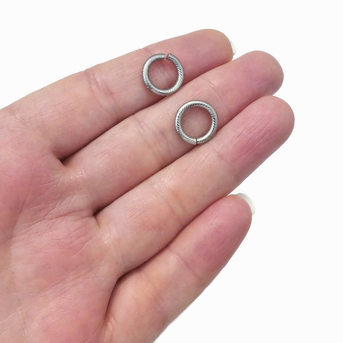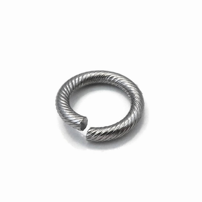 25 flush cut stainless steel jump rings, with a textured rope pattern - these are a 3/4 hard temper, making them a little easier to work with at this gauge, but remain a very strong ring suitable for a variety of decorative and structural uses in your craft projects.