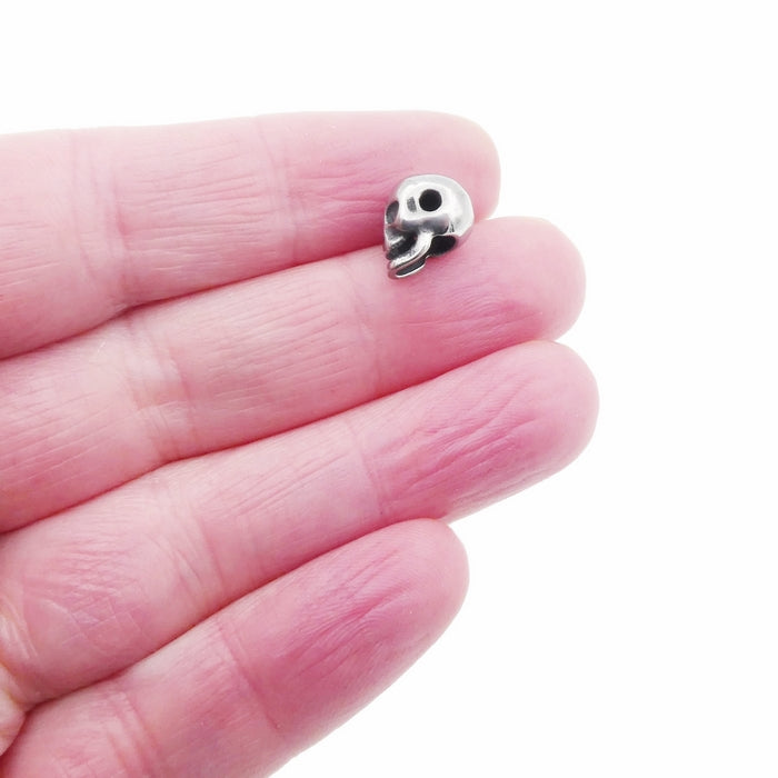Two highly detailed, solid stainless steel skull beads, with a polished finish and matte black wash to highlight details.