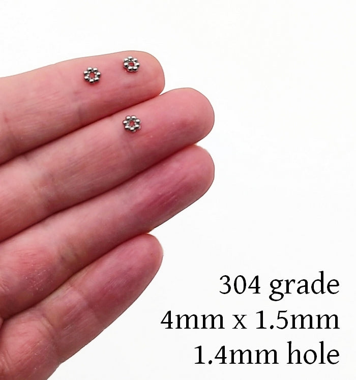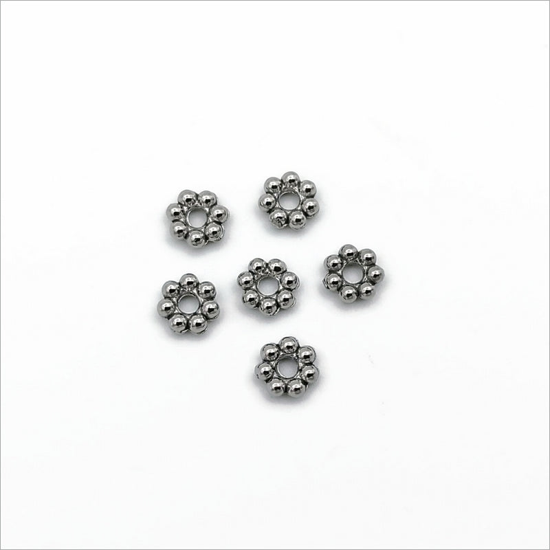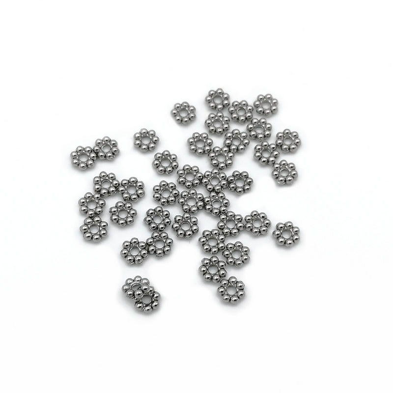 50 stainless steel round spacer beads with a dotted / daisy shape.