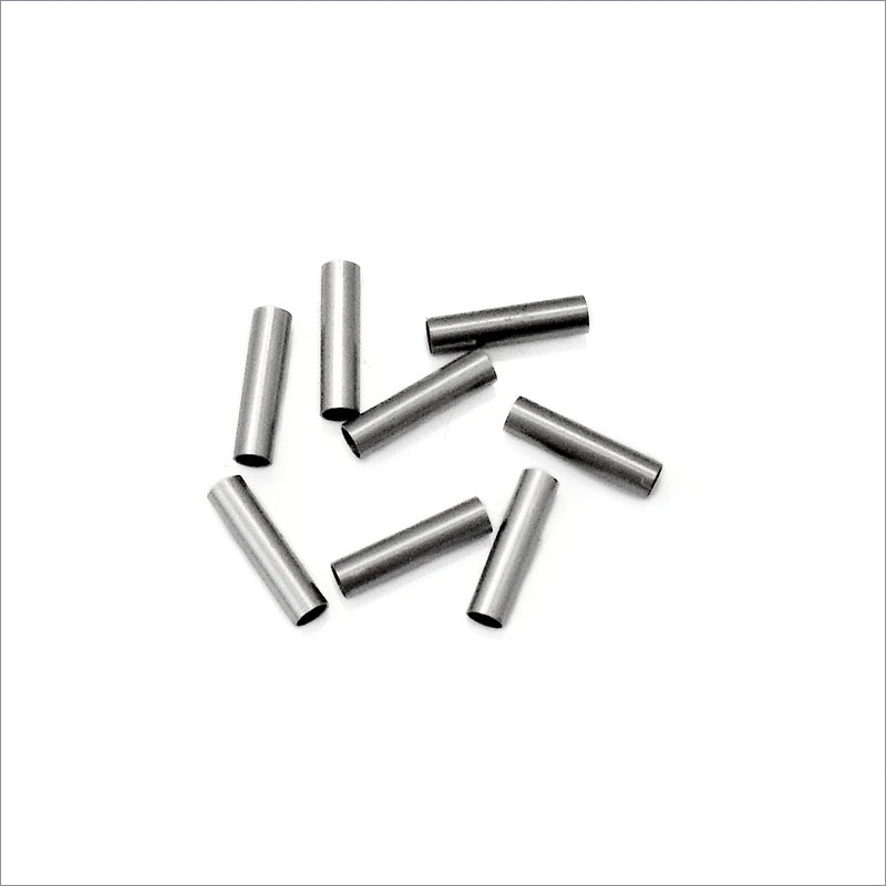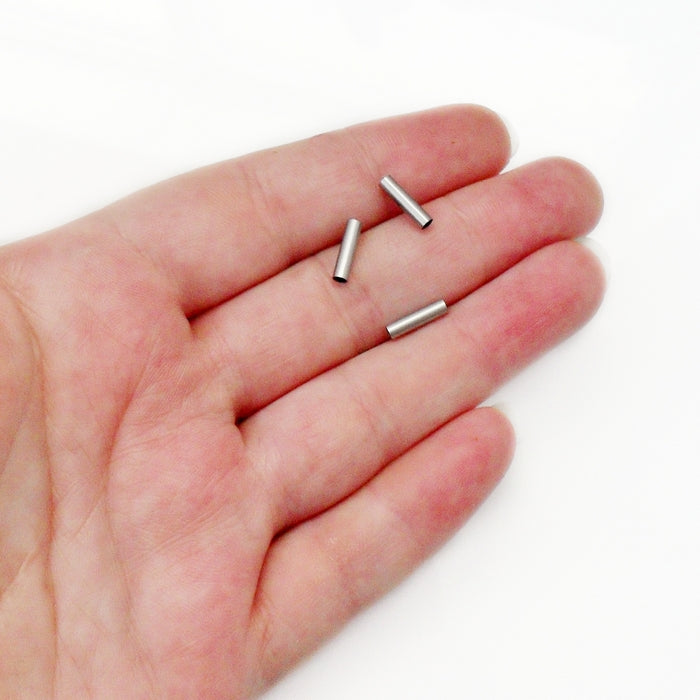 50 small, thin and light weight stainless steel tube beads, dark silver in tone with a matte finish.