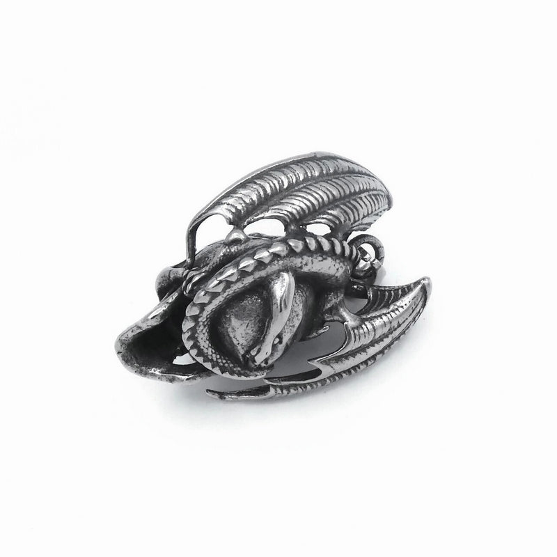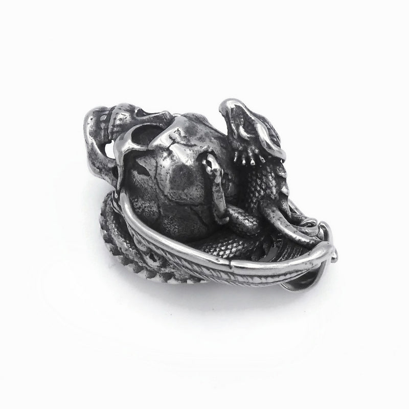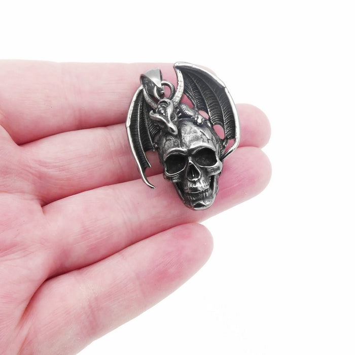 A well-detailed 3D pendant, featuring a winged dragon atop a skull, complete with a bail for stringing in to chain or cord - the measurements above are for the maxiumum dimensions of height x width x depth.
