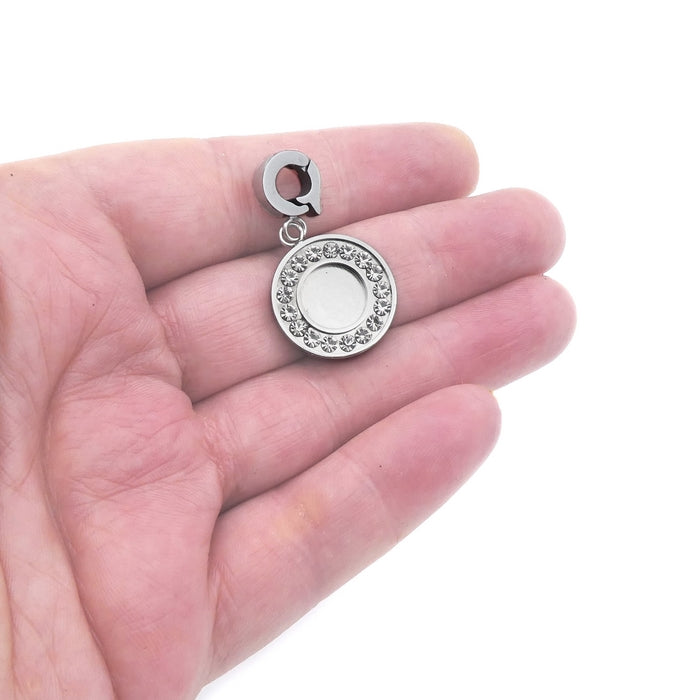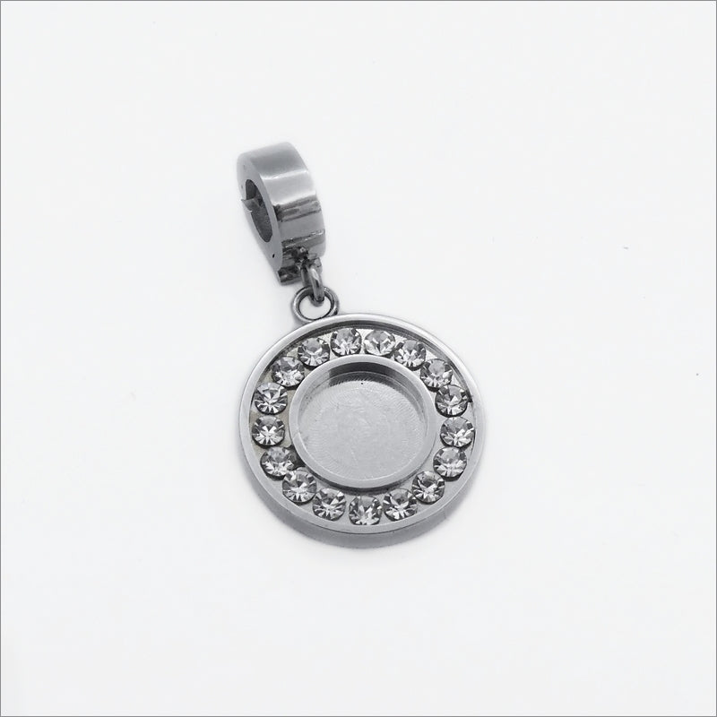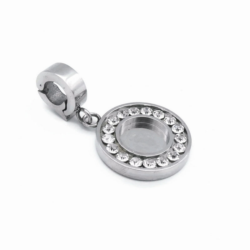 One premium quality solid stainless steel cabochon setting, featuring clear glass crystal rhinestones set around the tray, and with an attached clip that can latch on to cord, chain etc up to 4mm thick. (Please note: The clip and setting can not be separated).