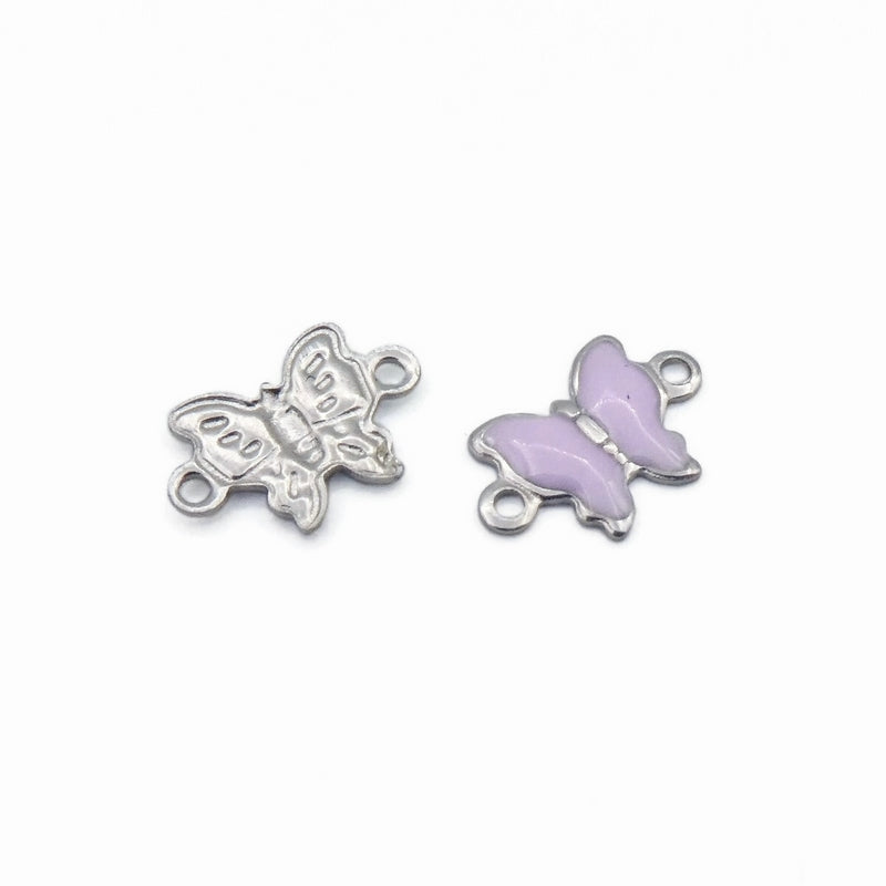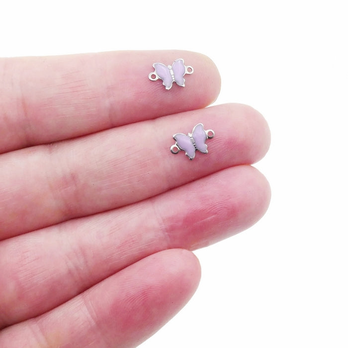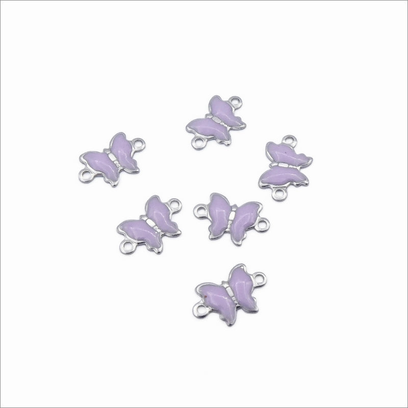 10 small butterfly charm connectors, hollow-backed and decorated with a light purple enamel.