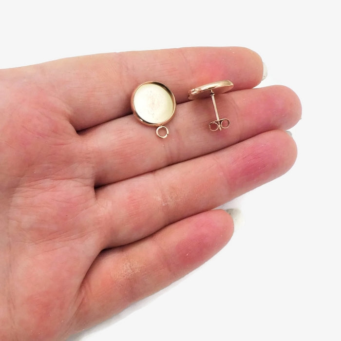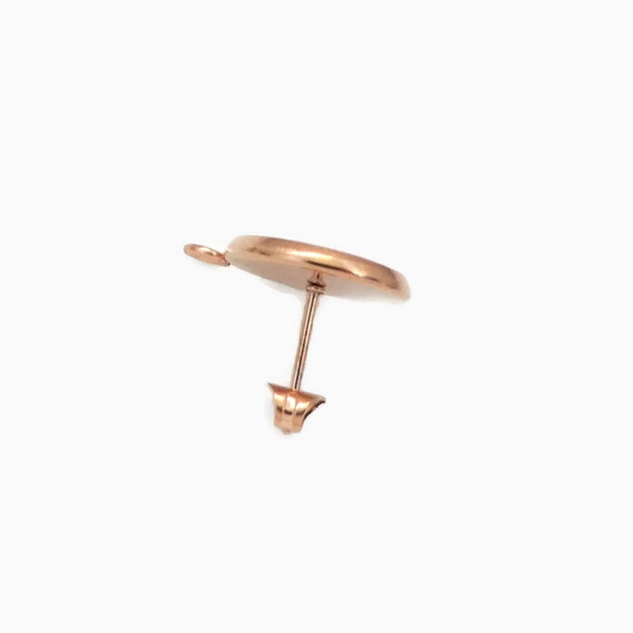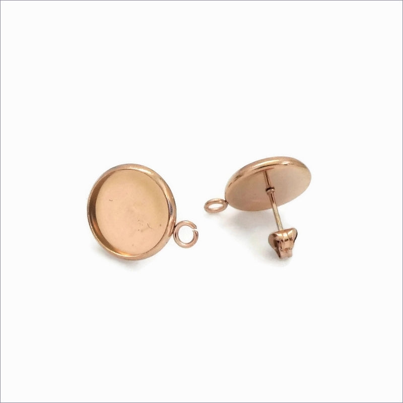 Five pairs of stainless steel earring studs with a round, 12mm diameter tray, plus soldered loop for attaching additional components, vacuum plated with a high quality and durable rose gold tone.