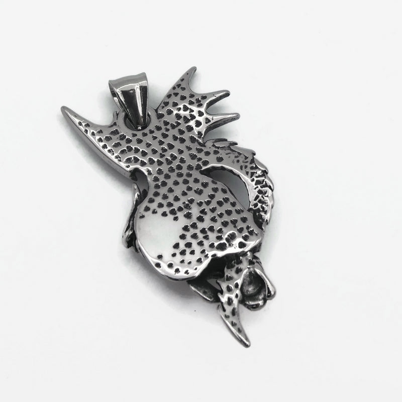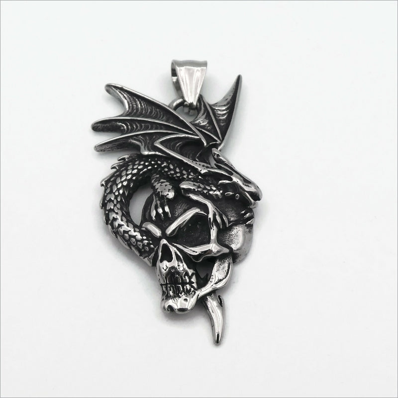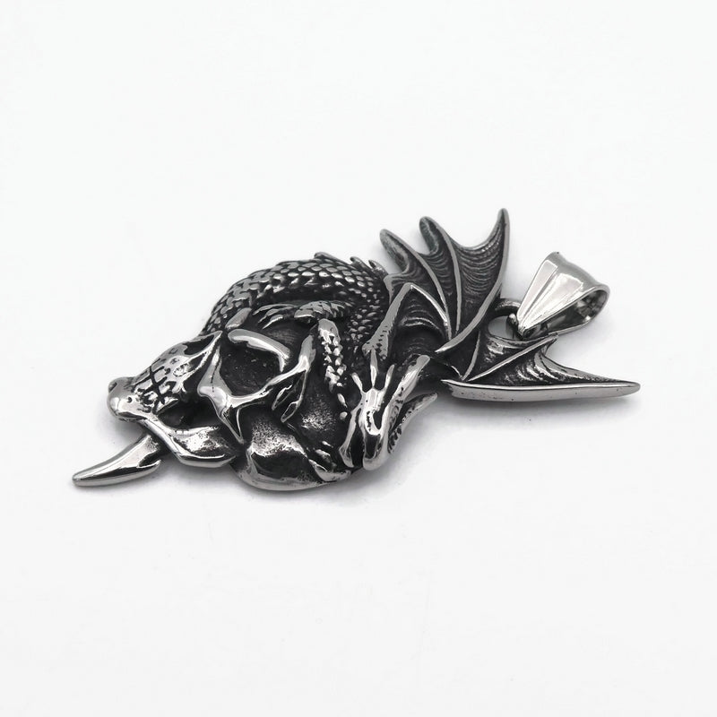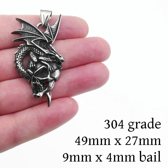 A large stainless steel pendant featuring a winged dragon atop a skull - includes an attached bail for immediate stringing onto chain or cord.