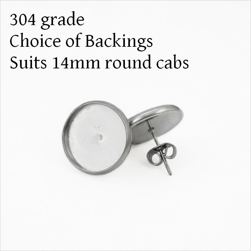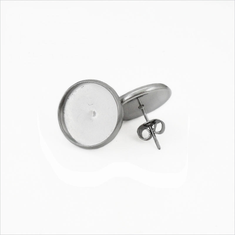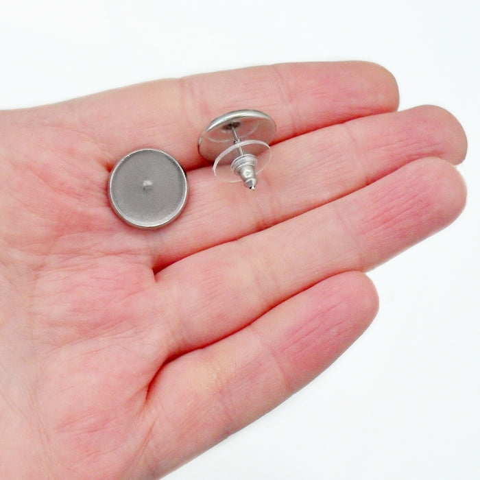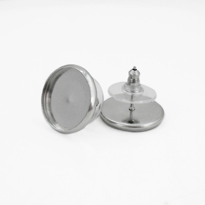 Ten pairs of stainless steel earring studs with a round, 14mm diameter tray.